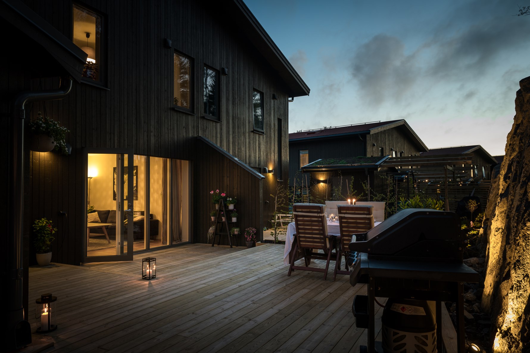 Vardagsrummet är en utmärkt plats för umgänge i goda vänners lag. Stora fönsterpartier bjuder på rikligt med ljusinsläpp som reflekteras fint i de ljusa väggarna. I rummet finner ni olika möbleringsalternativ som inkluderar en soffgrupp, bord och tv-möbel. En bra plats där hela familjen kan samlas. Från detta rum når ni även bostadens stora härliga uteplats. Under vårens och sommarens varma månader kan ni samlas här ute runt middagsbordet alternativt i en lounge med soffa för att njuta goda vänners sällskap. Stort trädäck som avgränsas av en upplyst bergvägg. Här ute har ni även ett praktiskt förråd om 6 kvm.