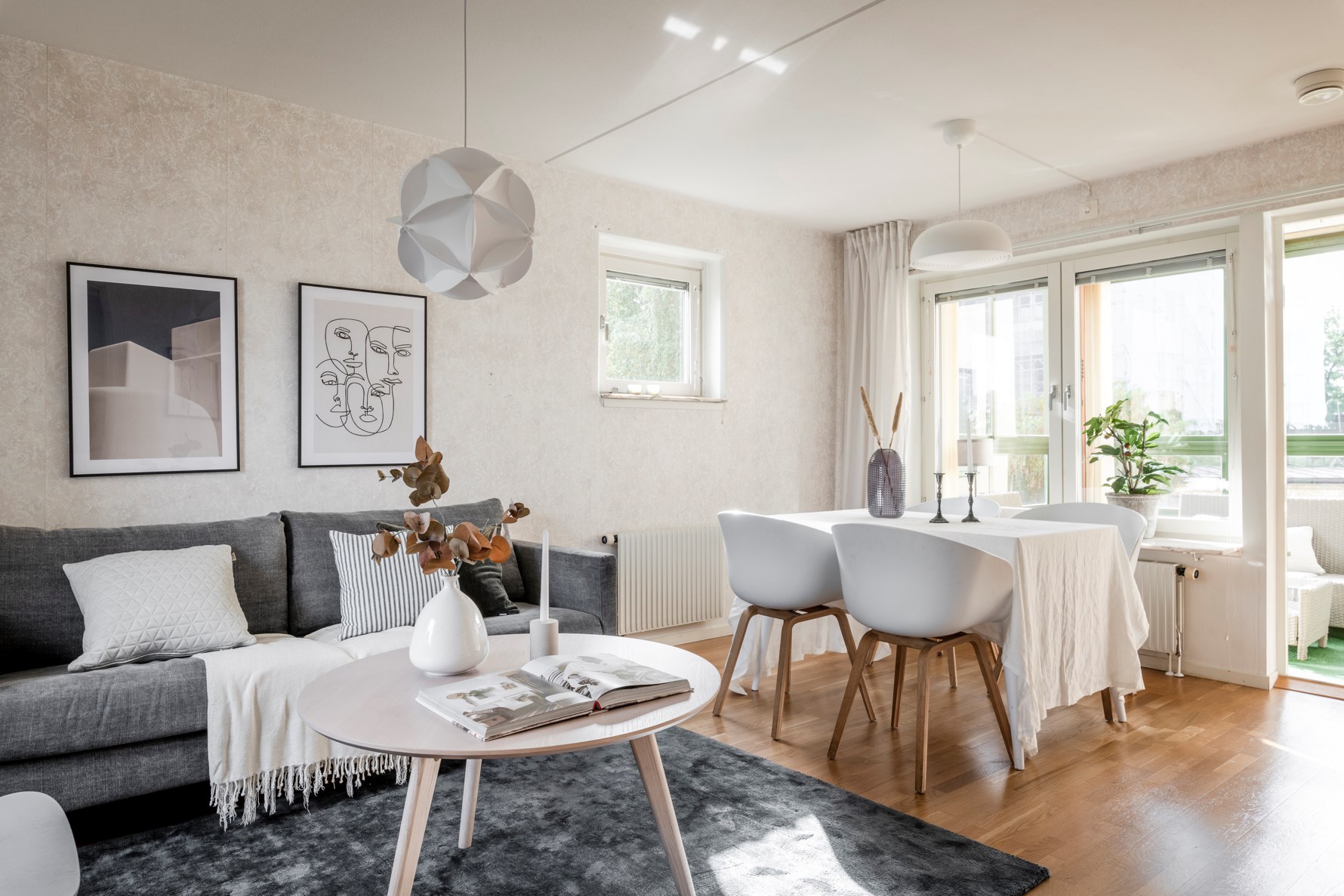 Vardagsrummet nås från tre olika rum och ger därför en social och öppen känsla. Här finns plats för soffgrupp med tillhörande möblemang samt matsalsbord om så önskas. Från vardagsrummet samt sovrum nås den inglasade balkongen där du gärna njuter av en kopp kaffe och morgonsolen!
