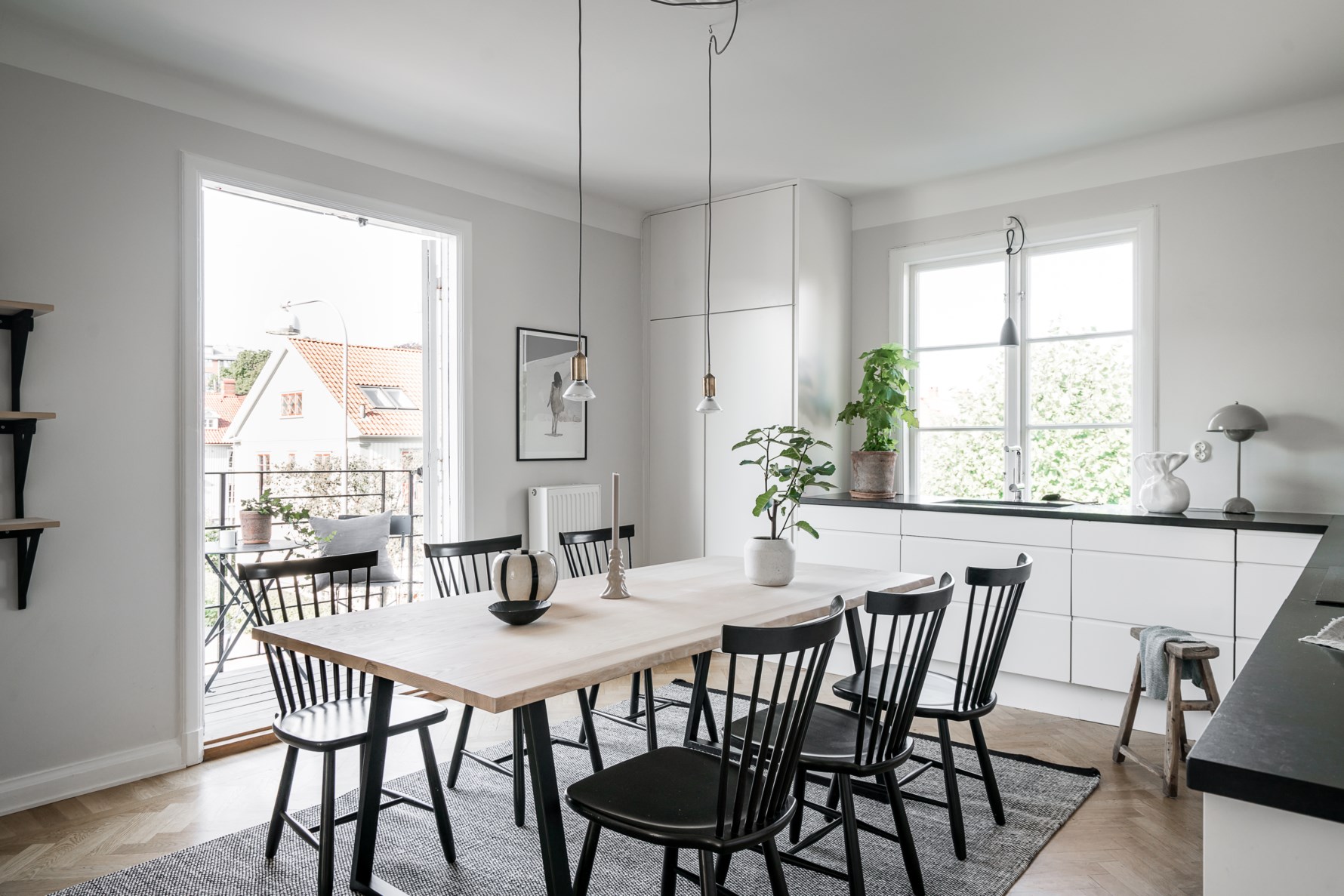 Till höger från hallen når man ett ljust och luftigt kök med utgång till en härlig balkong i västerläge. Platsbyggt kök med inredning från Haglunds Snickeri och bänkskiva i svart granit. Den maskinella utrustningen består av induktionshäll, spisfläkt, inbyggnadsugn med varmluftsfunktion, integrerad diskmaskin samt integrerad kyl och frys. Samtliga vitvaror är från Siemens. I köket ryms en matplats för stora middagssällskap. Golvet kläs av fiskbensparkett och väggarna är målade i en ljus ton.