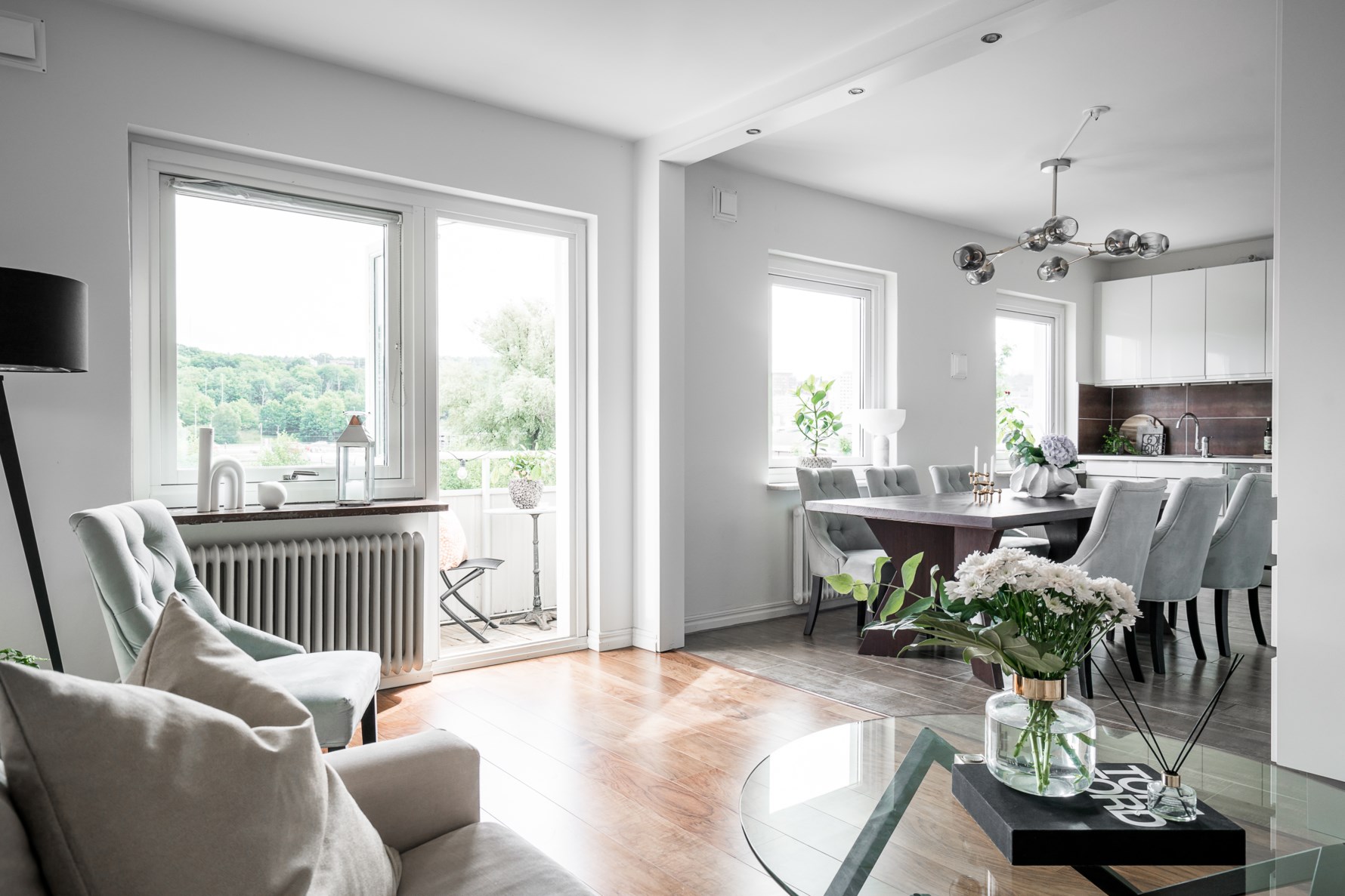 Trivsamt vardagsrum som kan inredas med en generös soffgrupp och övrigt möblemang. Fint ljusinsläpp från ett fönster med insynsskyddat läge samt utgång till lägenhetens balkong med behaglig morgonsol. Väggar målade i vitt och golv i valnöt.