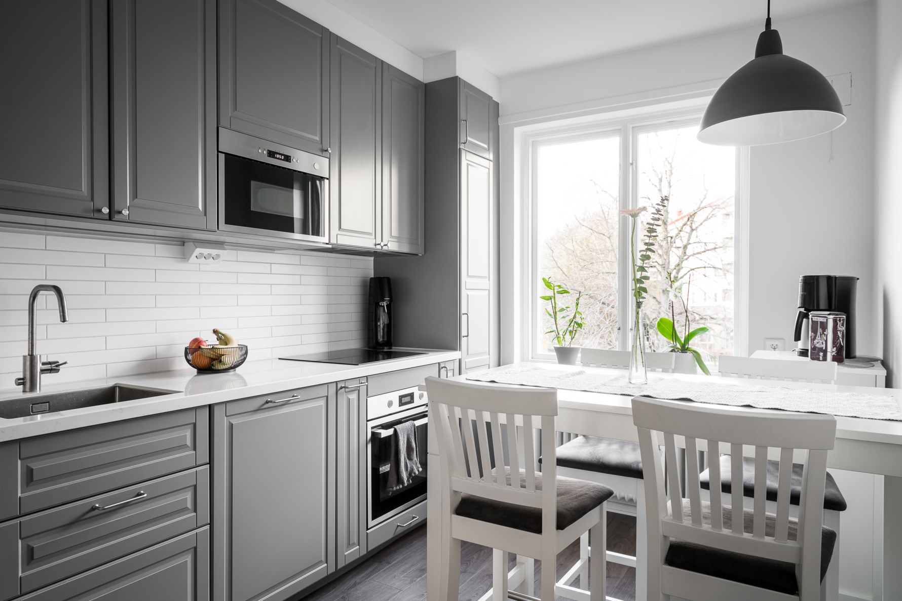 Väldisponerat kök med generösa förvaringsmöjligheter samt en given plats för matbord. Köket renoverades 2019 men de tidsenliga detaljerna så som vackra gjutjärnselement under de inredningsbara fönsterbrädorna i original finns fortfarande kvar. Ovan bänkskivan i vit marmormönstrad kompositsten sitter vitt kakel, köksluckorna är gråa. Den maskinella utrustningen består utav spishäll, ugn, fläkt, integrerad diskmaskin samt kyl/frys. På golvet ligger ett mörkt laminatgolv och väggarna är målade i vitt.