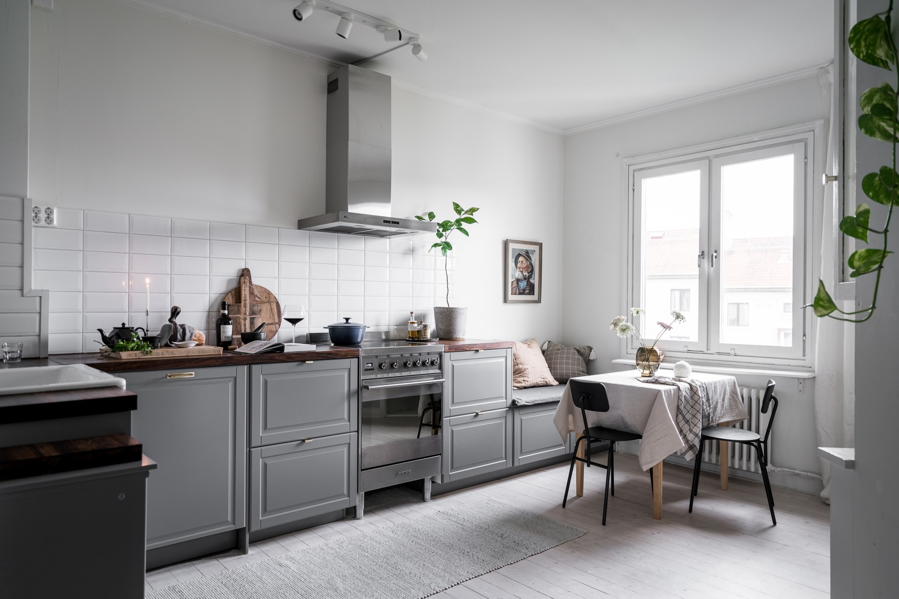 Direkt till höger ligger det härliga köket som har renoverats under 2018. Köksinredning i grått kombineras med bänkytor i massiv valnöt, porslinsvask och vitt blankt fasat kakel i rak sättning. Den maskinella utrustningen består av spis med induktionshäll och varmluftsugn (Smeg), kolfilterfläkt (Thermex), integrerad diskmaskin (Siemens) samt kyl med frys (Bosch). I köket finns ett bevarat skafferi samt serveringsskåp vilka bidrar med en stor dos charm. Invid fönstret som vetter mot gården har matplatsen sin naturliga placering.