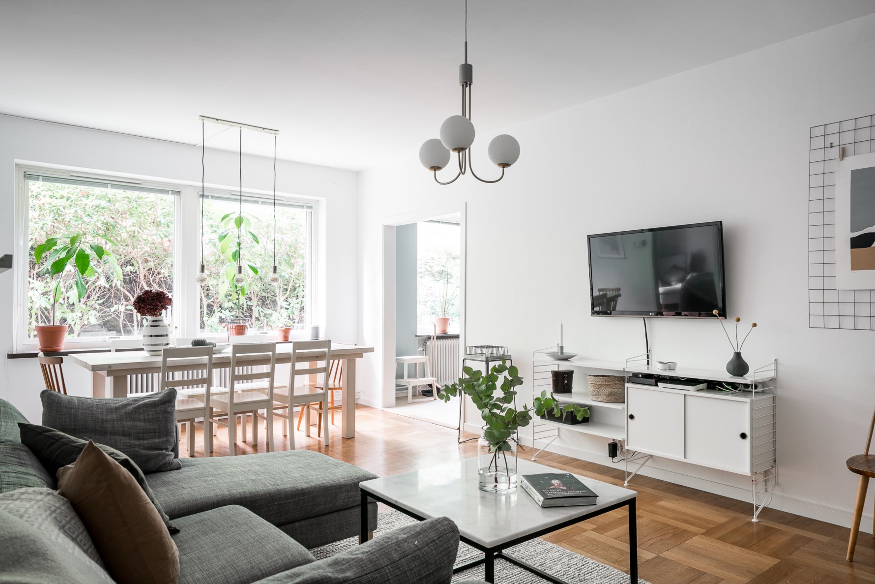 Vidare in i lägenheten nås det stora och trevliga vardagsrummet med generöst ljusinsläpp från stora fönsterpartier som vetter mot grönskan. Här erbjuds flera möbleringsalternativ och det finns gott om plats för soffgrupp, tv-bänk, skrivbord samt matplats. Vacker originalparkett och vitmålade väggar.
