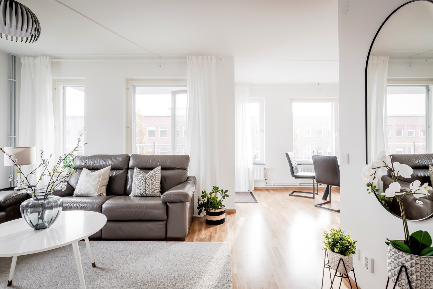 Vardagsrummet ligger i öppen planlösning mot köket och erbjuder generös yta för att möblera med soffgrupp och soffbord. I vardagsrum/kök fås trevligt ljusinsläpp från stora fönsterpartier i två väderstreck och härifrån nås även den trevliga balkongen som erbjuder sol under hela dagen.