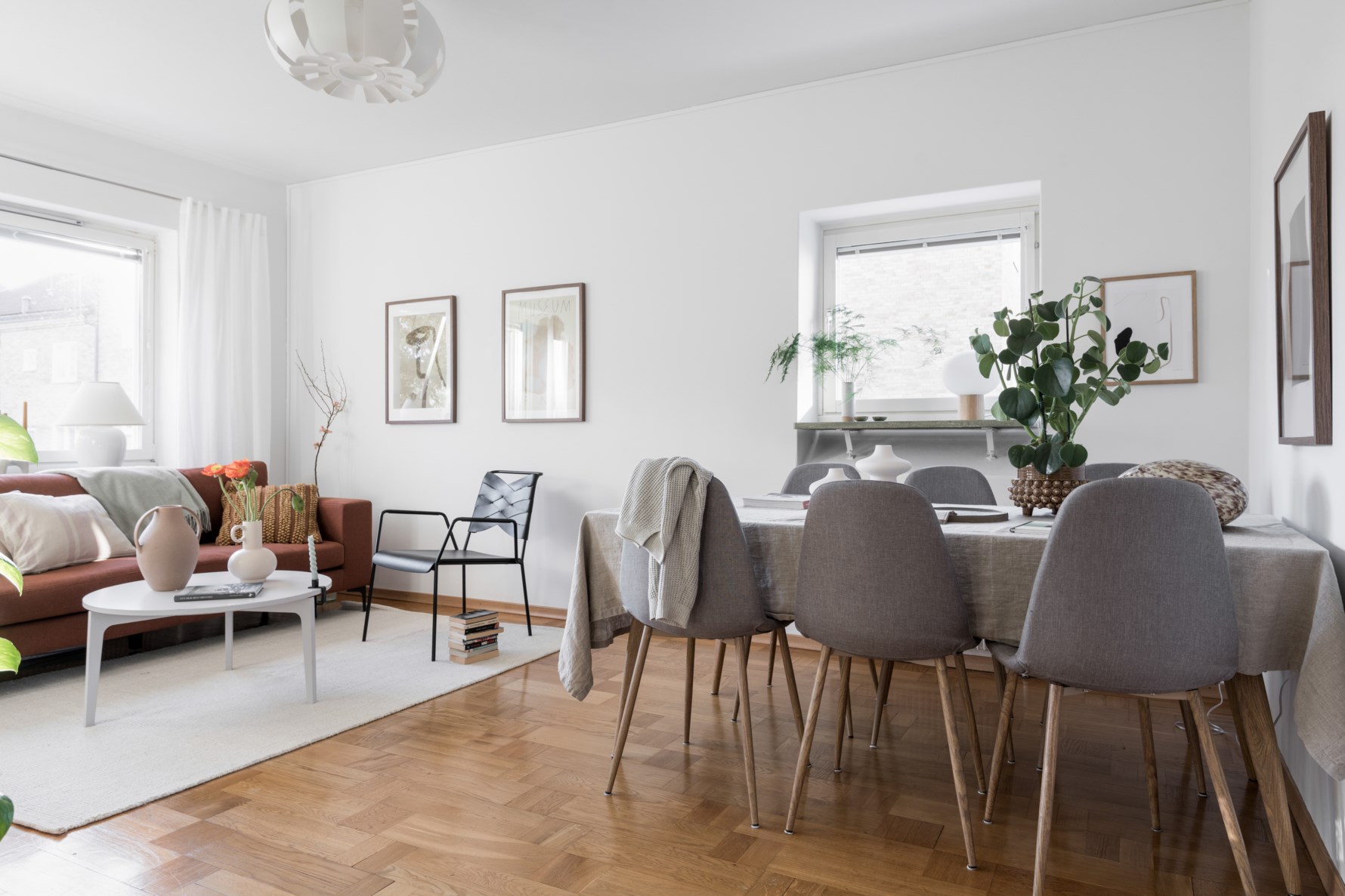 Rummet är stort nog att rymma matsalsbord samt soffgrupp.