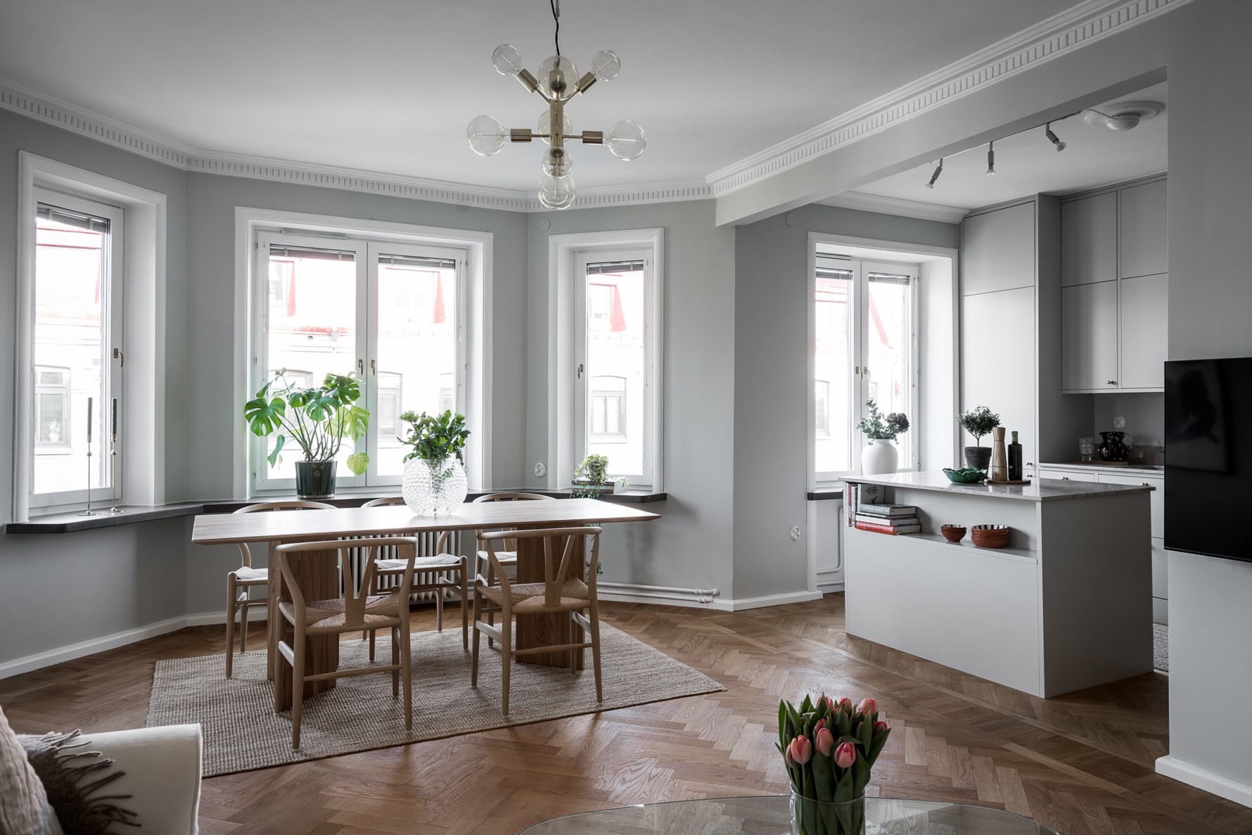 Ett par steg in i bostaden når ni köket som genom en öppen planlösning och köksö skapar ett socialt och öppet rum. De stora fönsterpartierna med burspråk ger ett generöst ljusinsläpp och fin utsikt över området. Vardagsrummet har rymligt med plats för soffgrupp samt ett större matbord. Köket är totalrenoverat från 2020 och noga utvalt från Marbodal. Luckorna är klassiska och släta i en ljusgrå kulör med silvriga knoppar. Generösa arbetsytor i marmor samt en platsbyggd köksö i samma design. Köket är utrustat med kyl, frys, induktionshäll, fläkt, integrerad diskmaskin och varmluftsugn – varav allt är nytt.