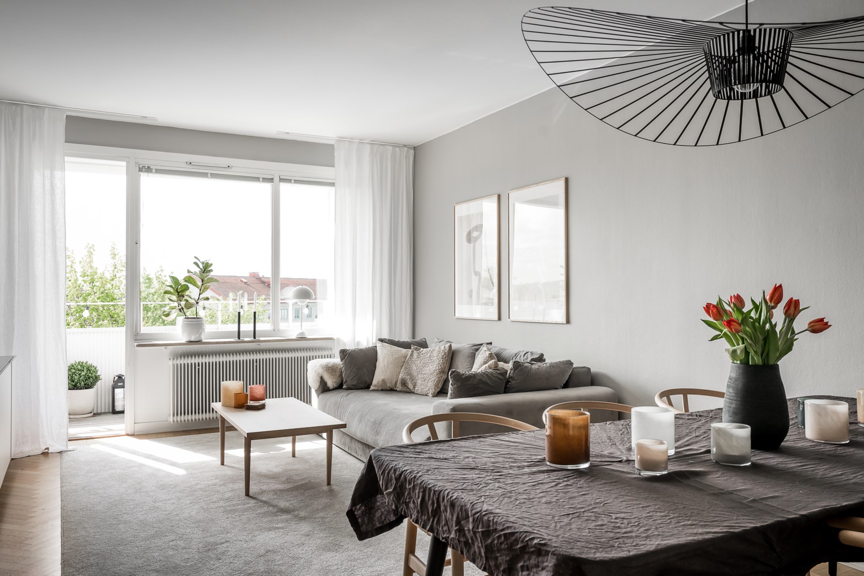 Väl tilltaget vardagsrum som präglas av ett generöst fönsterparti i insynsskyddat högt läge med fri utsikt över trädtopparna samt utgång till en söderbalkong som är en skyddad oas med fri utsikt. Fina fönsterbänkar i natursten och gjutjärnselement som bidrar med charm. Vardagsrummet kan inredas med soffa, stor matplats och övrigt möblemang. Golvet kläs av vacker fiskbensparkett och väggarna är målade i grått.