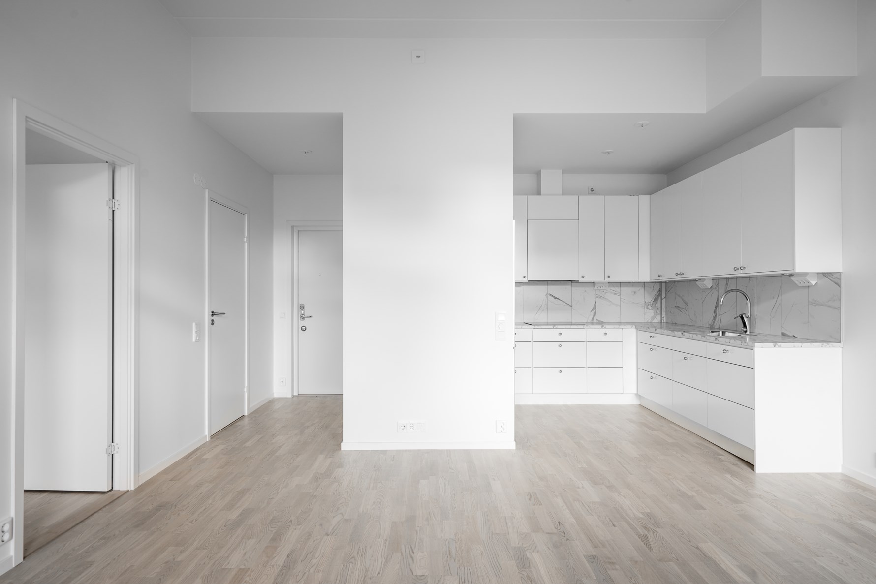 Lägenheten medför en rymlig och öppen känsla i i samband med den lite högre takhöjden på 3.3 meter i utrymmen som är utanför kök och köksuppställning.