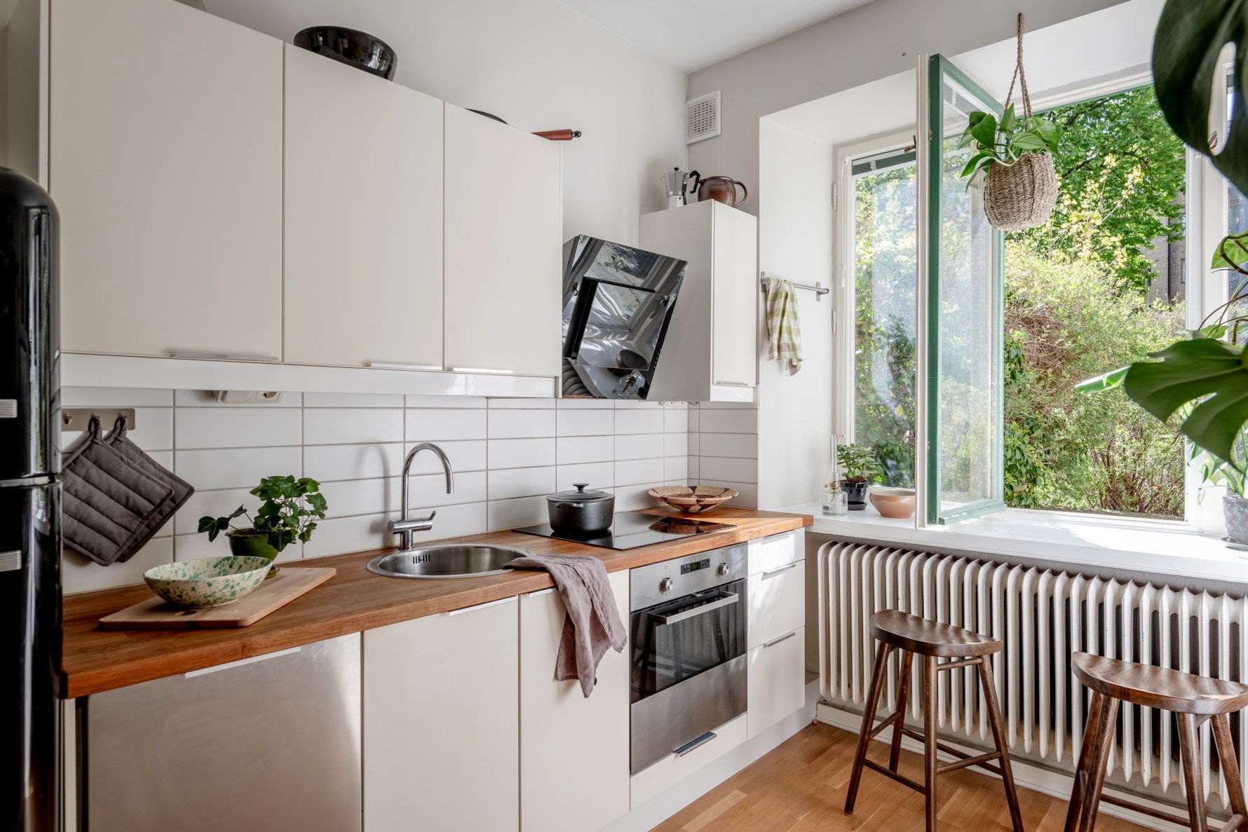 Innanför den egna entrén välkomnas ni av en mindre hall med plats för avhängning samt förvaring i en rejäl garderob. Därefter möts ni direkt av bostadens kök från 2010 som går i tidlösa färg- och materialval. Köksluckor i vitt, bänkskiva i ek samt vitt kakel som täcker väggpartiet ovan. Köket är utrustat med induktionshäll från 2021, varmluftsugn, kolfilterfläkt, diskmaskin samt ett kylskåp i svart från Smeg. Här fås ett fönster med djup fönsterbräda ut mot den lummiga innergården. Golvet täcks av en trestavsparkett i ek som också är genomgående för hela lägenheten och väggarna är genomgående målade i färgen Sommarsnö från Jotun.