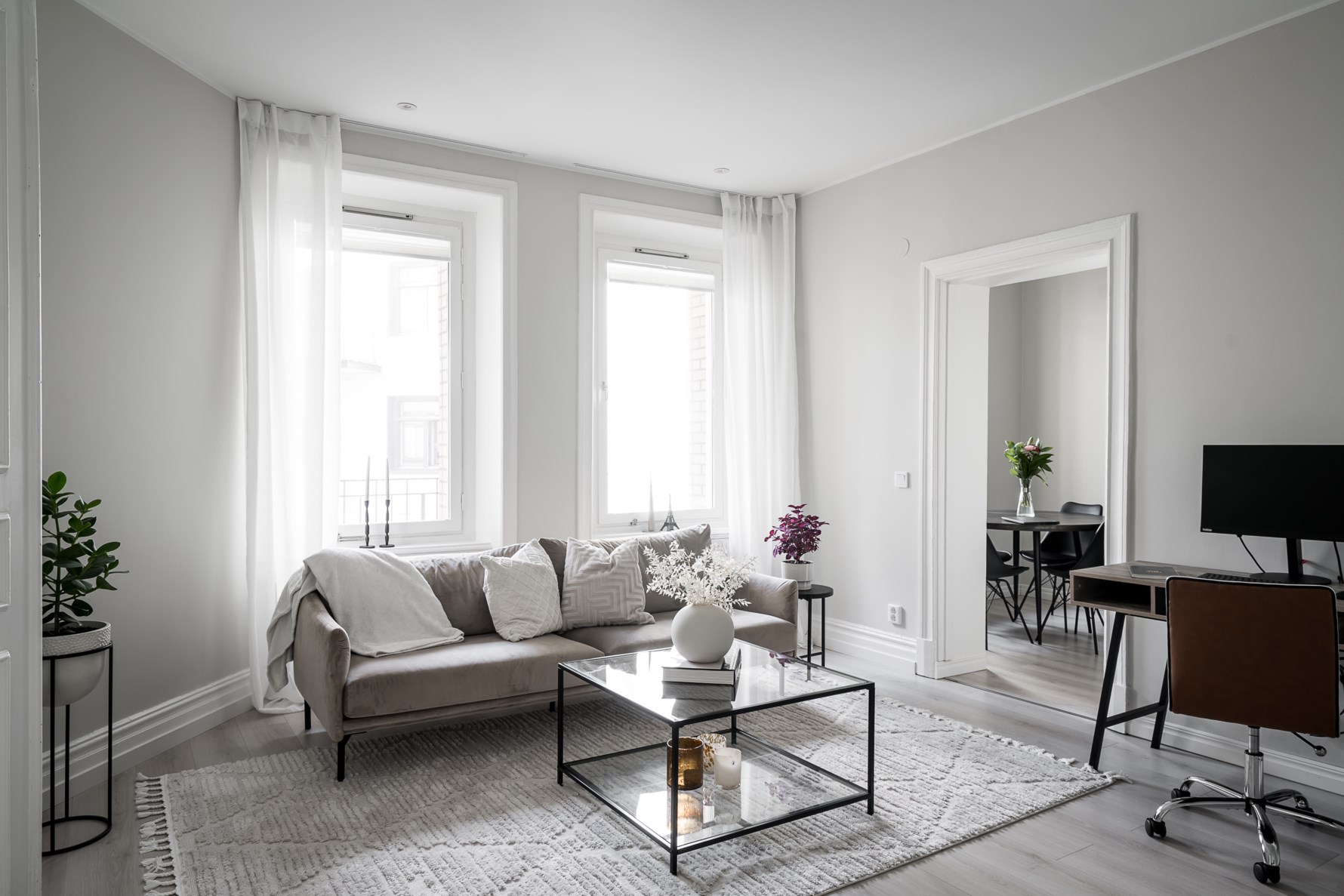 Vidare in i bostaden når ni det ljuvliga vardagsrummet med mycket karaktär och rymd. Här finner ni fina golvlister, vackra spegeldörrar, bevarad takrosett och stora fönster. Här erbjuds flera möbleringsalternativ med soffgrupp, tv-bänk och kontorshörna. En underbar plats att umgås med familj och vänner på eller att slå sig ner efter en lång dag. Det stora fönsterpartiet bidrar till ett fantastiskt fint ljusinsläpp.