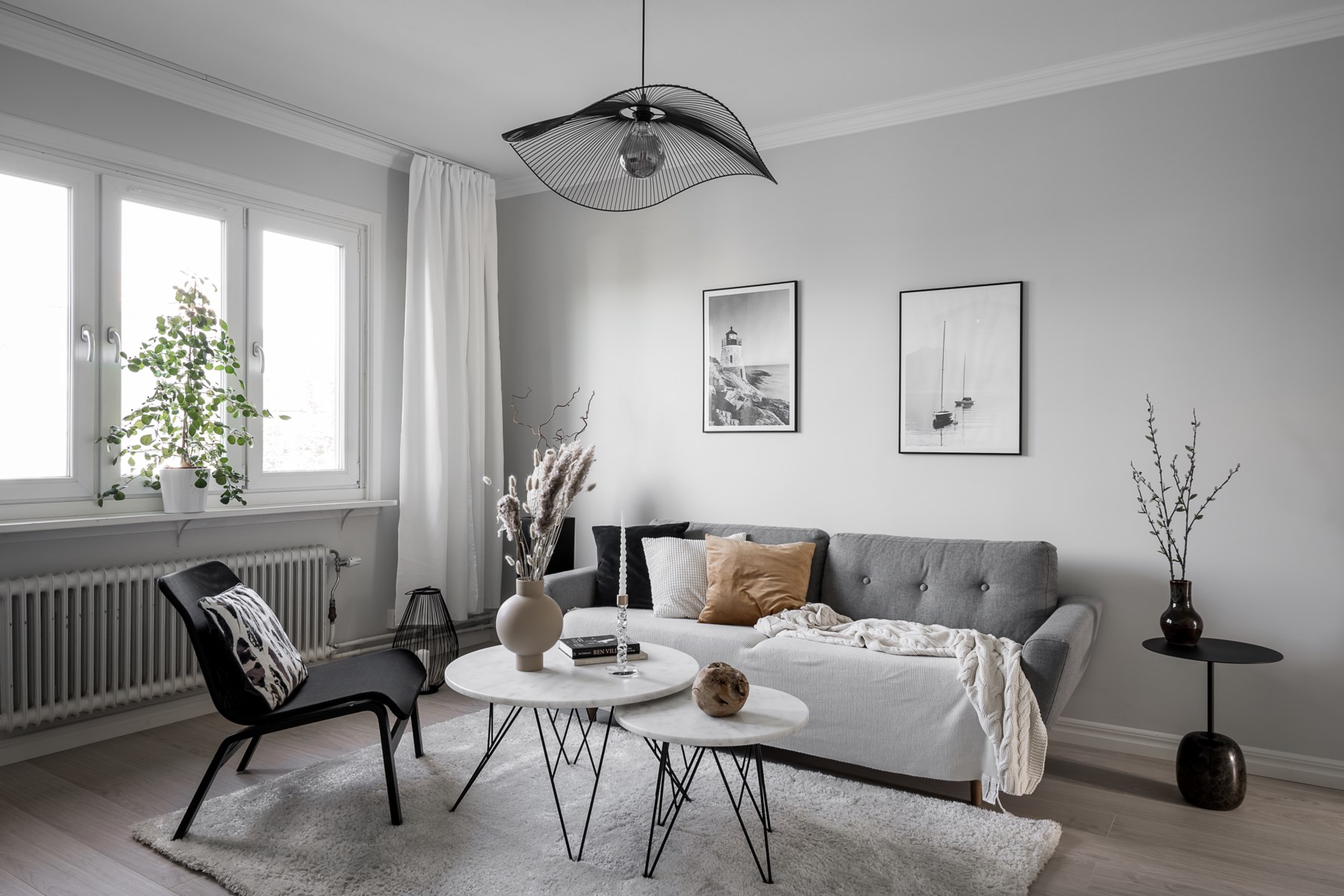 Vardagsrummet är ljust och rymligt tack vare den generösa takhöjden samt ett vackert och stort fönsterparti. Här ryms med lätthet såväl soffgrupp med tillhörande möblemang som skrivbord.
