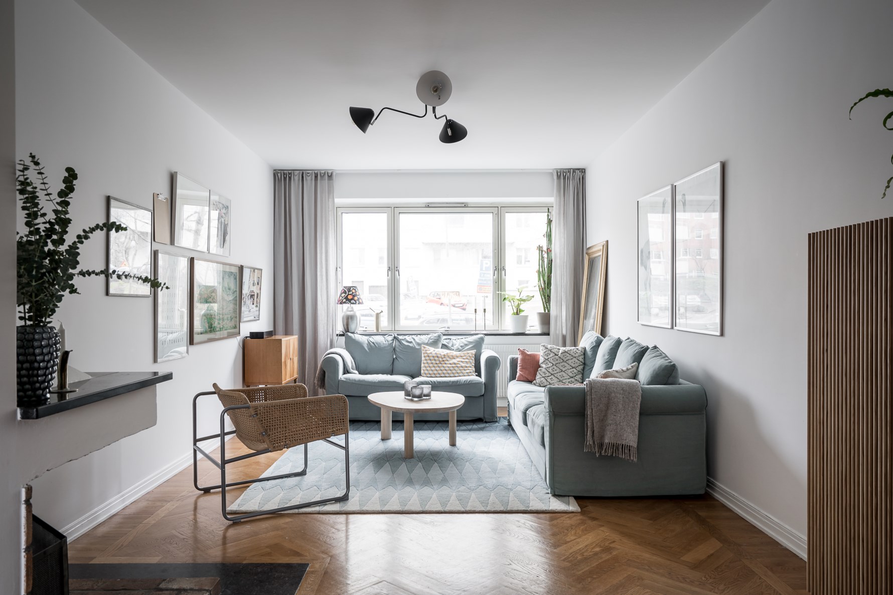 Väl tilltaget vardagsrum med fantastiskt ljusinsläpp från de generösa fönsterpartierna. Här kan man inreda med en större soffgrupp samt ett matsalsbord med plats för många gäster. Vacker fiskbensparkett och fungerande öppen spis skänker extra lyx till bostaden.