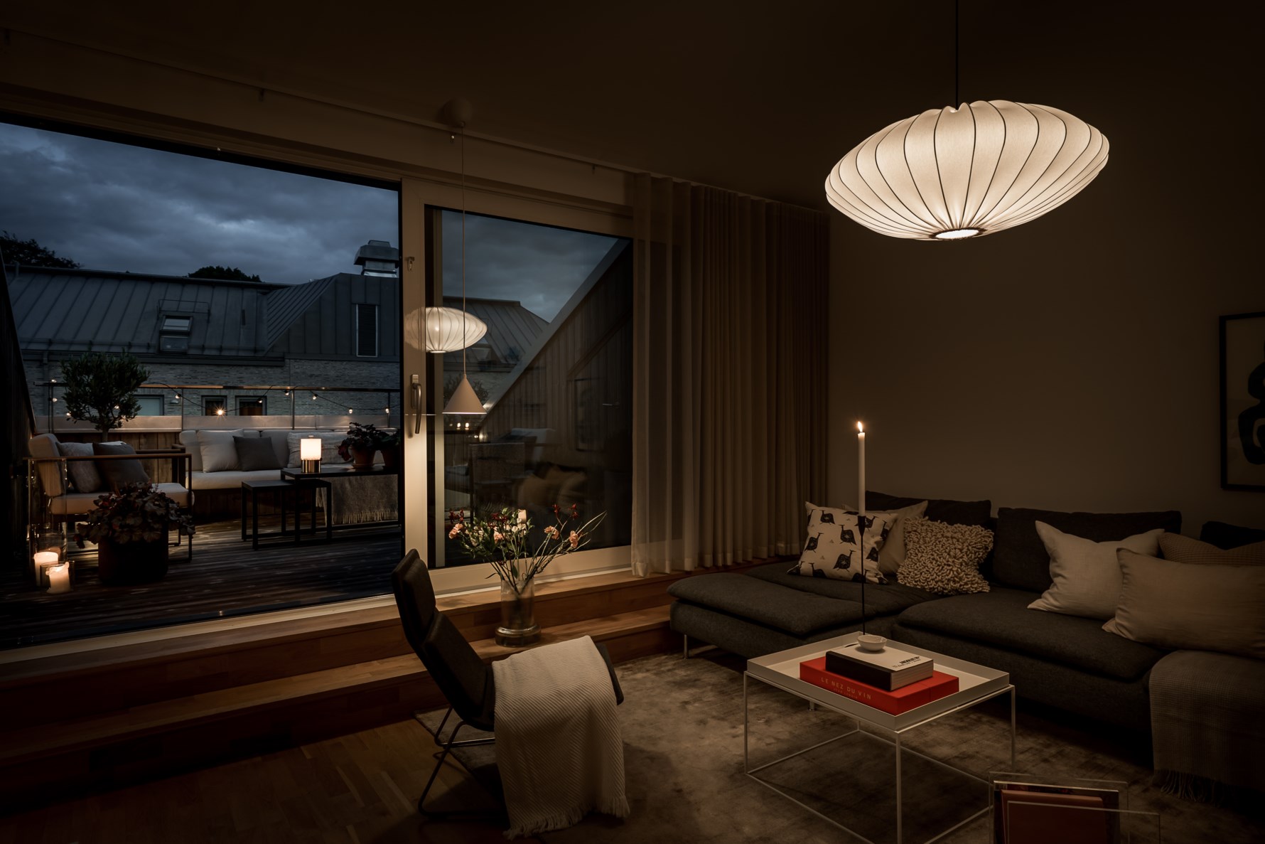Ett par steg in möter ni det otroligt fina ljusinsläppet som kommer från två väderstreck. I varje rum finner ni stora fönsterpartier från golv till tak som öppnar upp och skapar en oslagbar rymd. Detta hem har mycket karaktär med en ovanligt generös takhöjd och på vissa platser öppet upp till nock. Den öppna planlösningen mellan vardagsrum och kök bidrar till goda ytor att umgås på. Vardagsrummet erbjuder flera möbleringsalternativ och är idag inrett som matsal där hela familjen får plats och samlas efter en lång dag för en god middag. Härifrån når ni en av bostadens balkonger. Här ute går det utmärkt att inreda med bord och stolar och är en plats att nyttja hela året som ett extra rum då balkongen är inglasad.