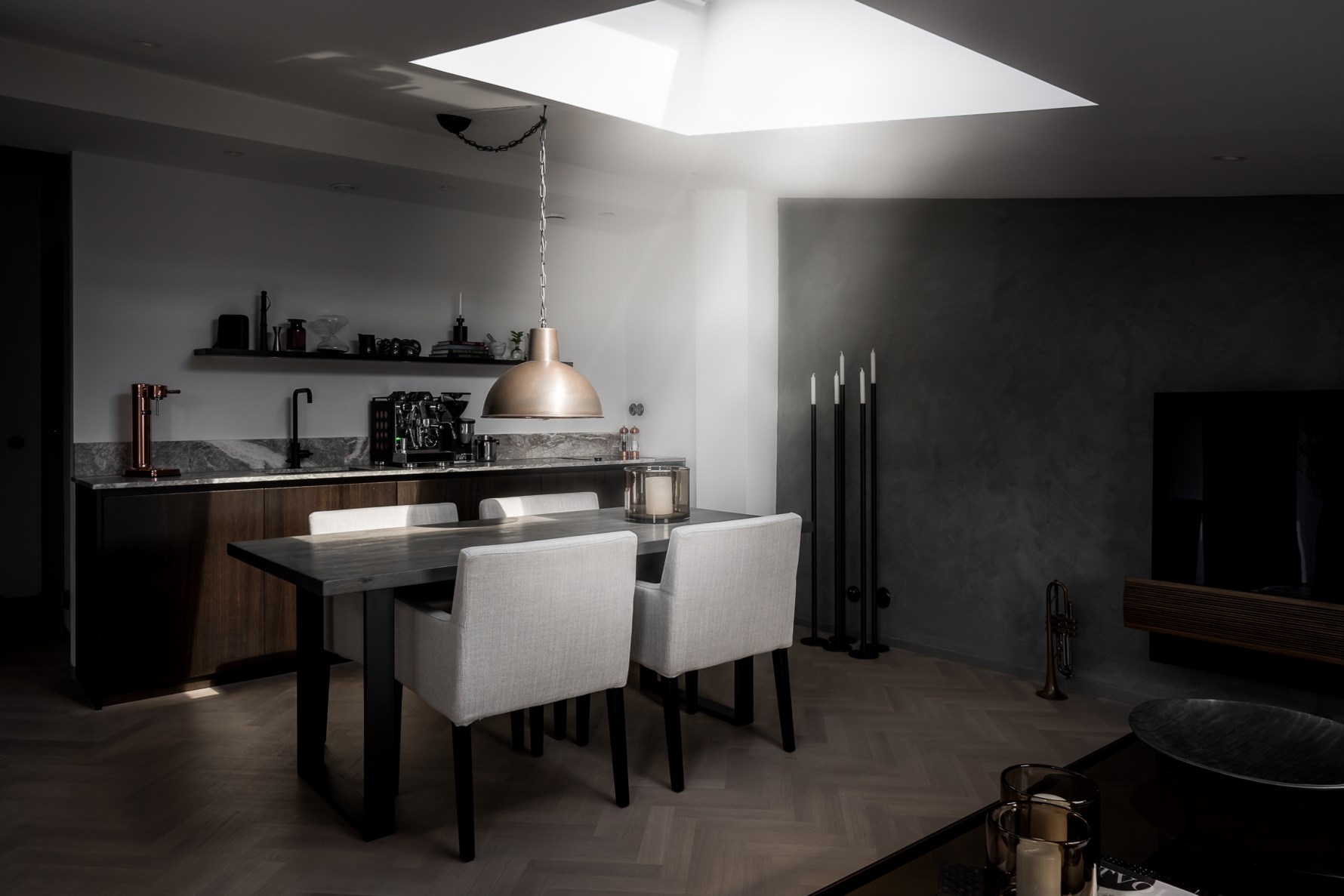 Påkostat Kvänumkök i rökt ek med bänkskiva och stänkskydd i sten samt vitvaror ifrån Gaggenau. Infälld vask och blandare i mattsvart. Den maskinella utrustningen utgörs av en extra bred induktionshäll med integrerad fläkt, integrerad diskmaskin, inbyggnadsugn, inbyggnadsmikro samt integrerad kyl och frys. De rena linjerna i kombination med materialvalen ger köket ett urbant uttryck.