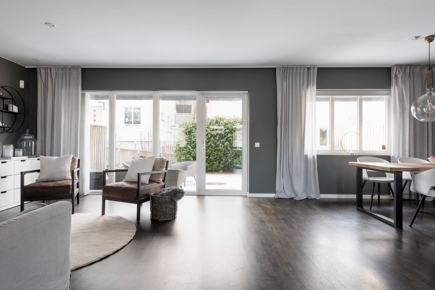 Hallen har bra möblerbara ytor och förvaringsmöjligheter utgörs av separata garderober. Väggarna är målade i antracitgrått och intrycket förstärks med den rustika klinker i mörkgrått som har golvvärme och avgränsar hallen. Hallens klinker övergår i en mörk och rökig ekparkett som inger en genuin känsla av djup och skapar en rustik karaktär, vilket är genomgående för bostaden.
