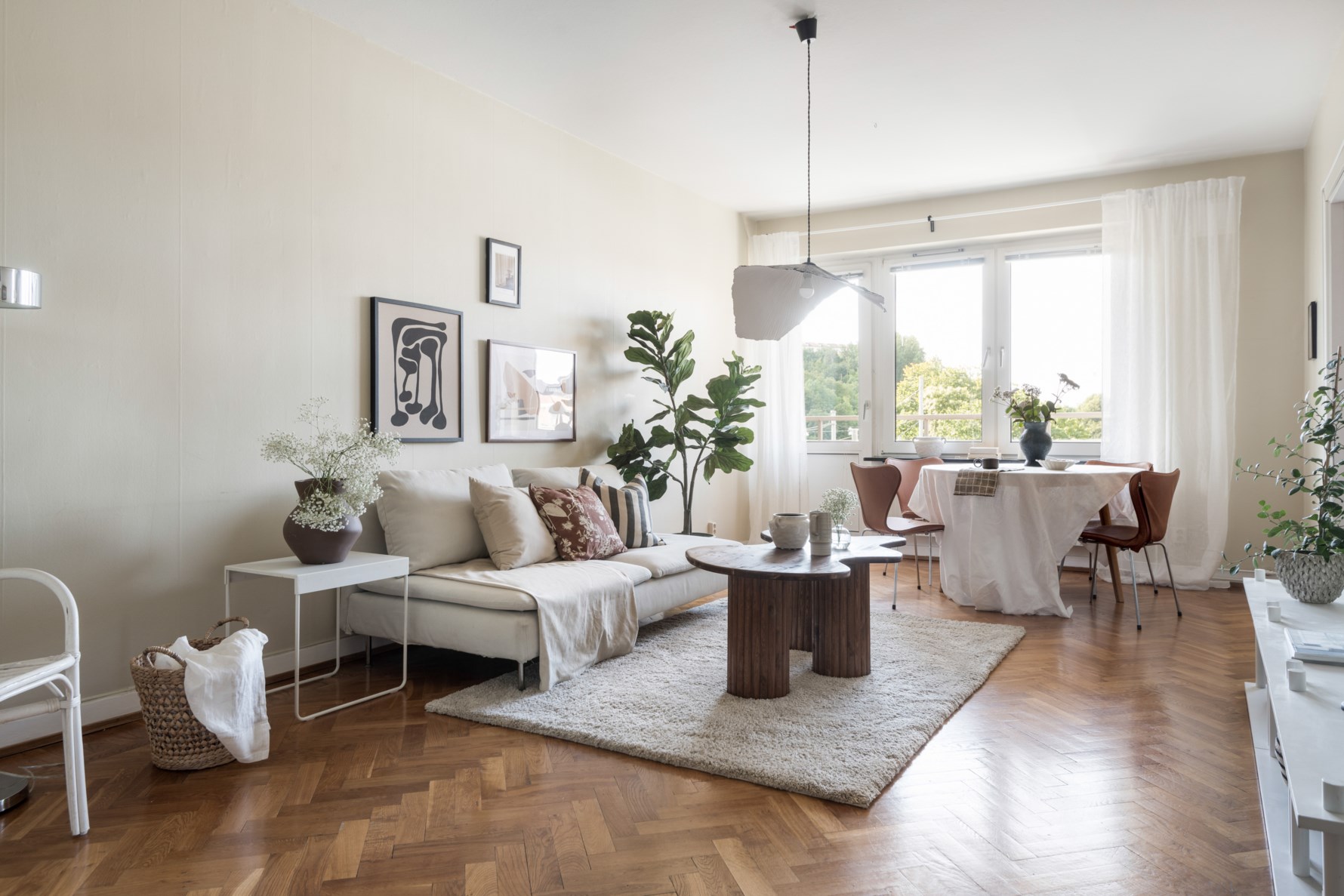 Från hallen, genom två vackra dörrar når du vardagsrummet som är stort och luftigt. Här finns rymligt med plats för soffhörna, soffbord samt matsalsbord med plats för flera personer. Vackert ljusinsläpp från ett generöst fönsterparti. Från vardagsrummet når ni lägenhetens soliga balkong som ligger insynsskyddat med fri utsikt. Golvet kläs av vacker fiskbensparkett. Här finns möjlighet till att renovera och bygga om till kök och vardagsrum i samband.