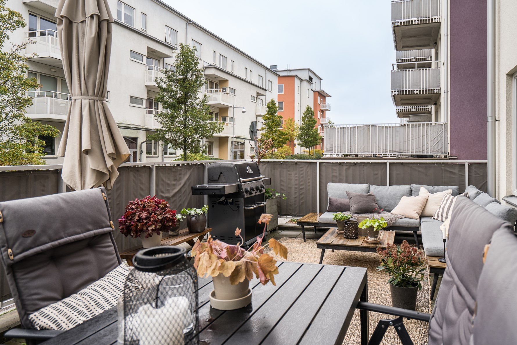 Med access från vardagsrummet, precis så som man vill ha det. Bostadens pärla med fina utsiktsvyer ner mot vattnet, sol från förmiddag till kväll och generös i storlek. Uteplatsen är upphöjd från gatan vilket gör den insynsskyddad.