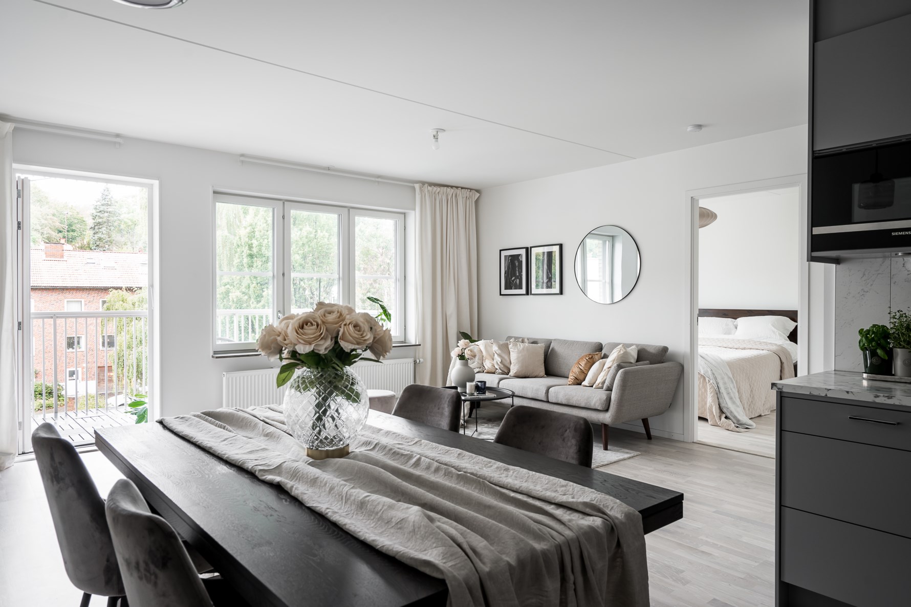 Härliga sällskapsytor i öppet samband med fint ljusflöde från flera fönster och utgång till en rymlig balkong i sydvästläge. Den generösa ytan ger utrymme för en soffgrupp, matplats för stora sällskap samt övrig inredning.