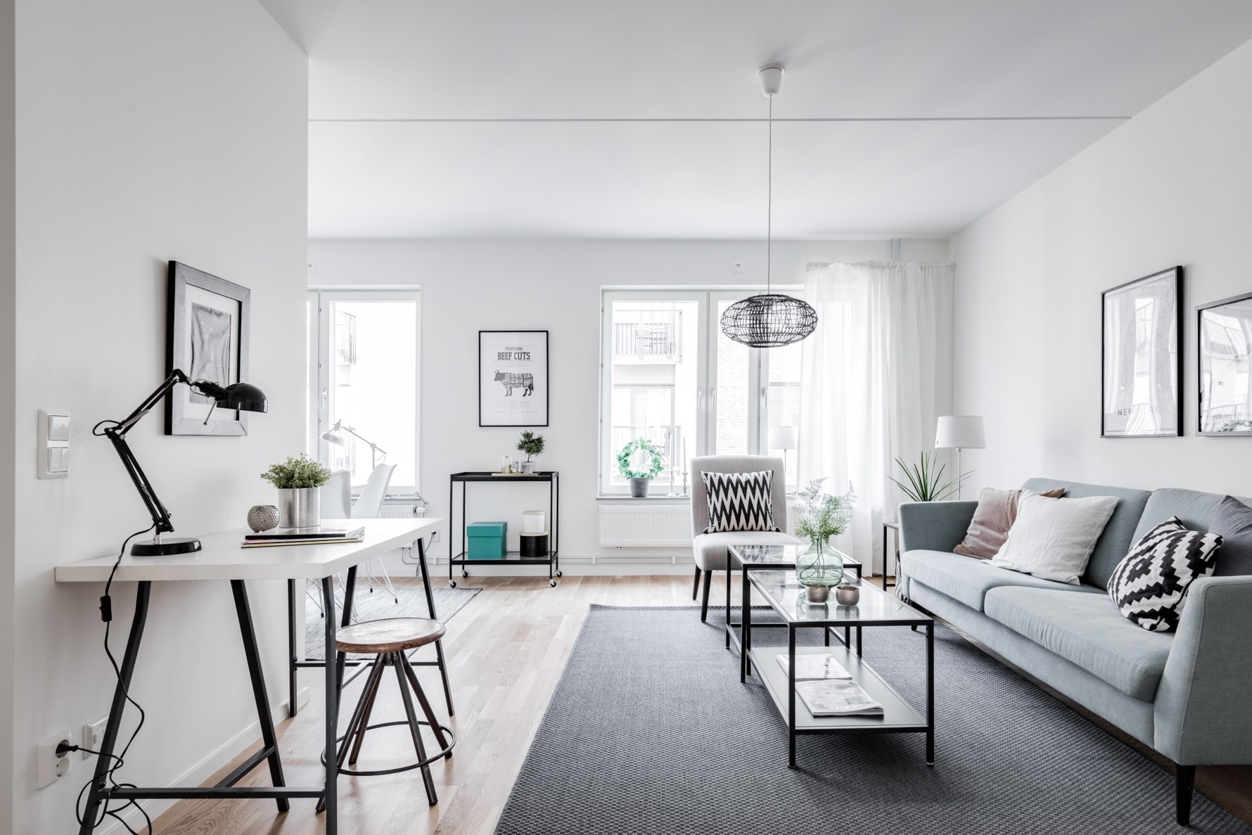 Inne i bostaden möts man av en hall med plats för fri avhängning samt goda förvaringsmöjligheter i fyra platsbyggda garderober. Lägenheten har genomgående mattlackad ekparkett och vitmålade väggar vilket skapar en enhetlig bas.