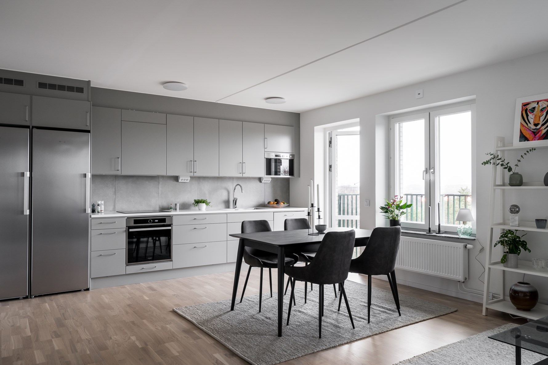 Köksinredningen kommer från Ballingslöv med slätt utförande på luckor som går i en varmgrå ton. Med integrerad diskmaskin och köksfläkt samt inbyggd micro och ugn får du ett enhetligt uttryck, vilket ramas in av bänkskivan i vitt laminat med underlimmad diskho och en induktionshäll. Köksblandaren kommer från Mora och vitvarorna från Whirlpool. Ljus ekparkett på golv och målade väggar i vitt. Bostadens inredningskoncept är både tidlöst och klassiskt.
