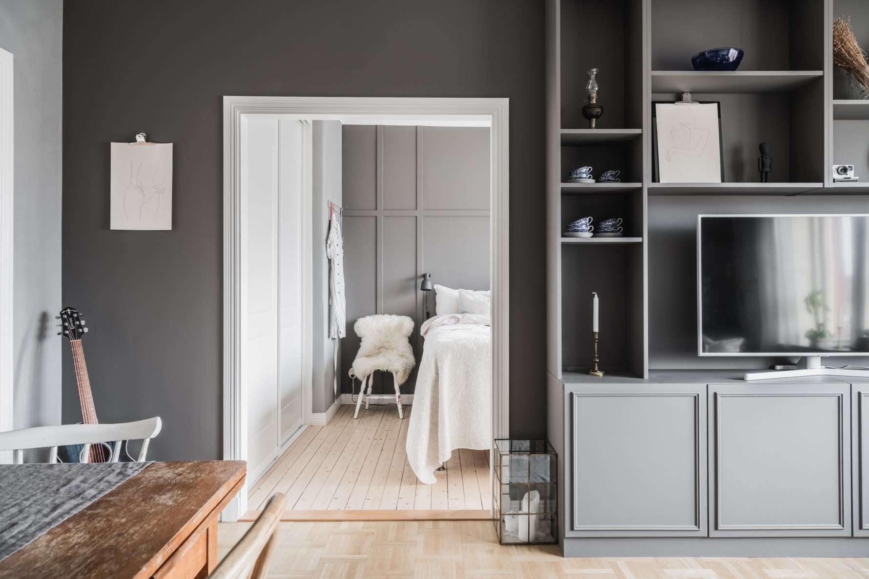 Vardagsrummet som nås från hallen får fint ljusinsläpp tack vare fönsterpartiet i västerläge. Här fås plats med soffgrupp med tillhörande möblering samt matsalsbord om så önskas. Väggarna är här målade i en behaglig grå ton där man också passat på att måla in en platsbyggd hylla som inte bara är oerhört snygg utan även praktisk då den sväljer både en tv och erbjuder en hel del förvaring. Golvet täcks av ett parkettgolv i original lagt i holländsk läggning.