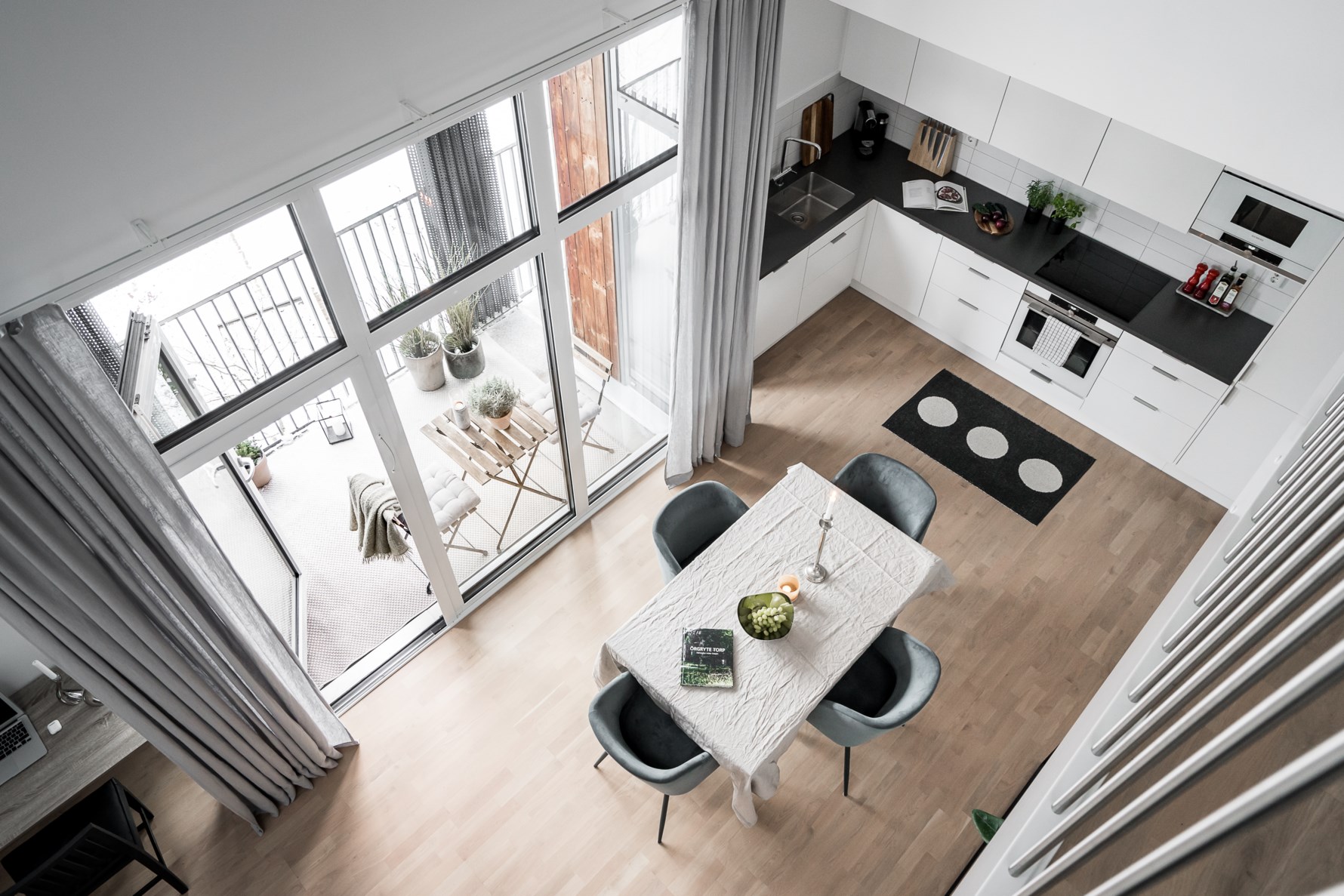 Öppen härlig planlösning mellan kök och vardagsrum där ljuset flödar in fritt från stora fönsterpartier. De stora fönsterpartierna sträcker sig från golv till tak och ger ett exklusivt intryck i kombination med den generösa takhöjden som är drygt 4 meter till högsta punkten. Härifrån nås lägenhetens rymliga balkong i söderläge som ni kan möblera med loungegrupp. Sällskapsytorna kan möbleras med en soffgrupp samt ett matsalsbord för stora middagssällskap.