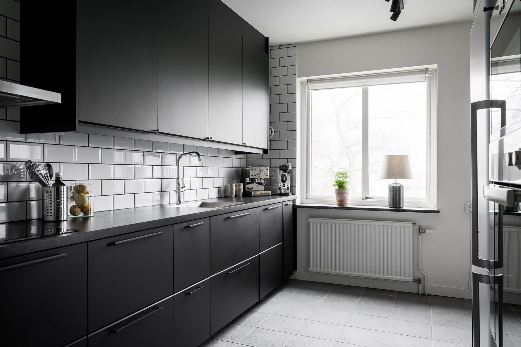Köket är smakfullt renoverat med köksinredning i svart, bänkskiva i mörk stenimitation och vitt kakel hela vägen upp till tak. Här erbjuds kvalitativa materialval, goda arbetsytor samt gott om förvaringsmöjligheter. Den maskinella utrustningen utgörs av induktionshäll från Gorenje, kolfilterfläkt, varmluftsugn från Gorenje, mikro, integrerad diskmaskin samt en kombinerad kyl med frys från Cylinda. Ett stort fönsterparti bidrar med rikligt ljusflöde och intill finns plats för en liten matplats om så önskas.