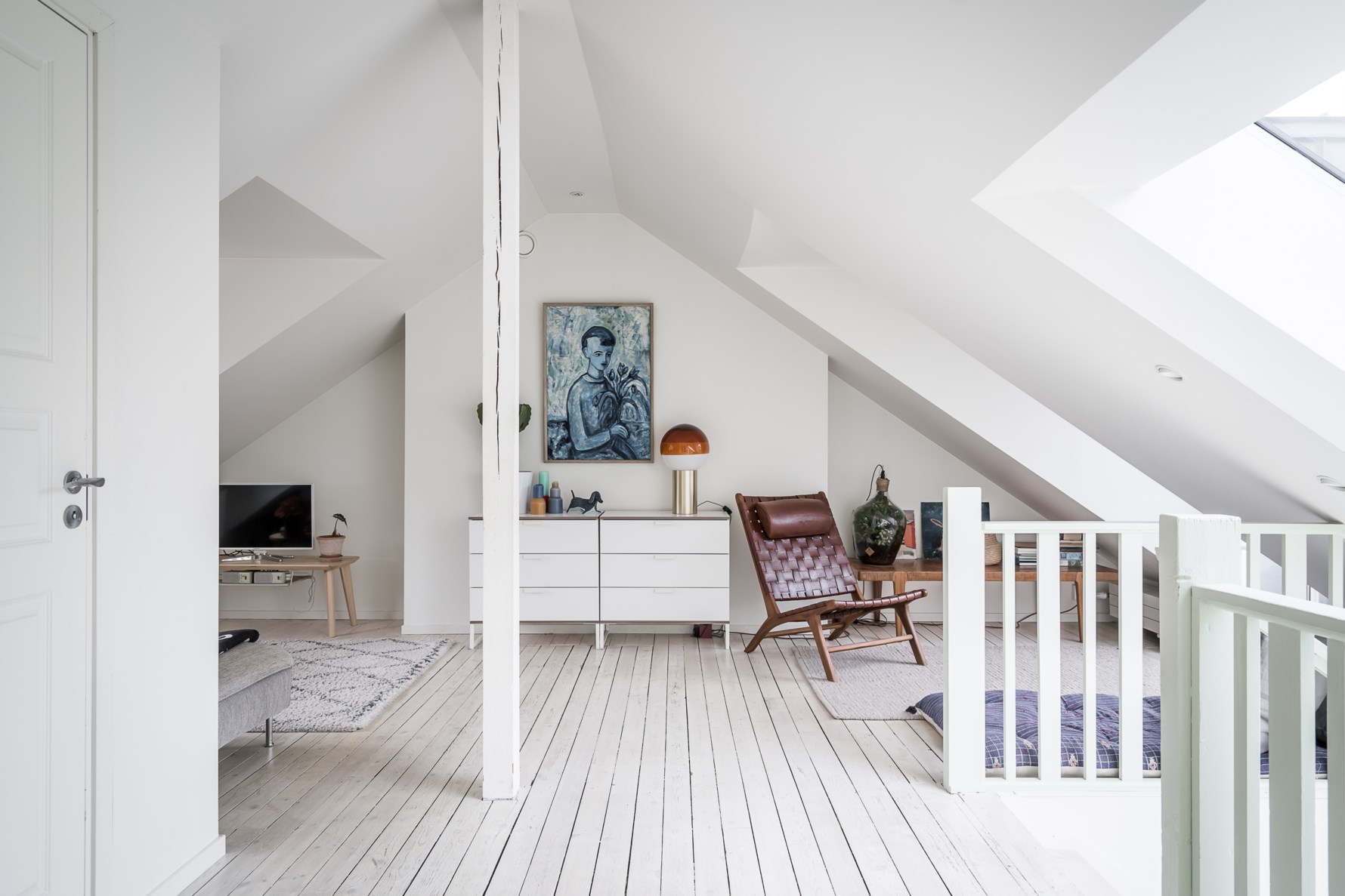 Via en trappa med ett stort takfönster leds man vidare upp till vindsplanet. Vindsplanet utgörs till största del av ett stort allrum som erbjuder flera valmöjligheter för inredningen. Genomgående ljusflöde från två väderstreck och pardörrar i glas ut till balkongen som har högt läge mot den grönskande gårdssidan. Allrummet har vitbetsade trägolv och vitmålade väggar. I dagsläget har vindsplanet två sovrum med det kan lätt skapas ett tredje om man önskar.