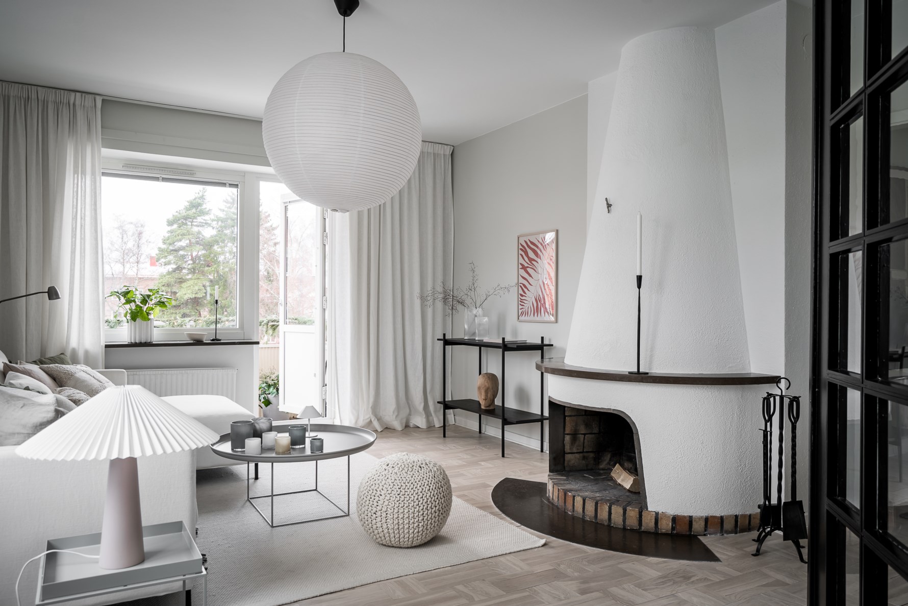 Innanför ytterdörren möts man av en möblerbar hall med plats för fri avhängning och förvaringsmöjligheter i en inbyggd garderob. Genomgående i nästan alla rum kläs golven av vacker parkett i holländsk läggning som är behandlat med Osmos vitpigmenterade hårdvaxolja i nyansen Snövit och väggarna är målade i Jotuns färg Tidlös 1024.