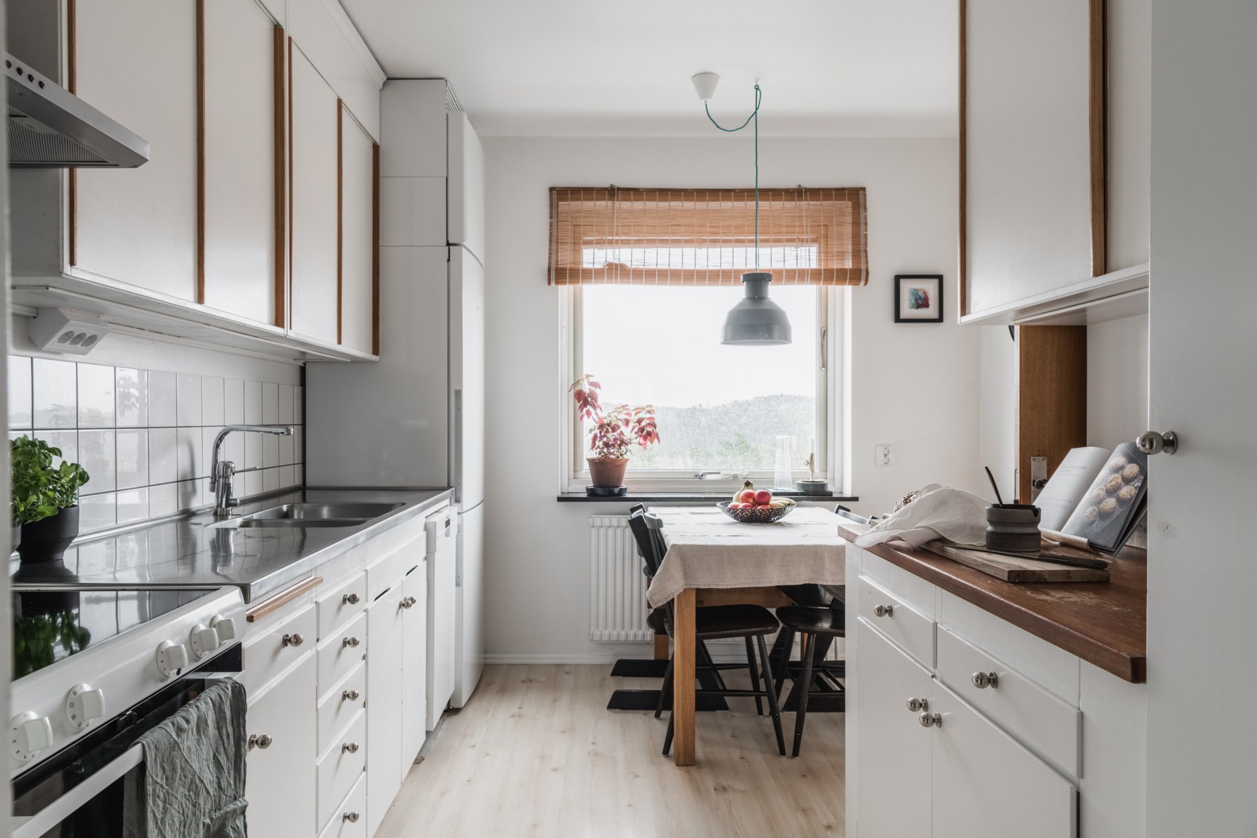 Köket är placerad på andra sidan av vardagsrummet vilket gör att förmiddagssolen lyser upp hela dagen och även detta fönster bjuder på en fin utsikt. Här har man tagit vara på originalköket och behållit dess charm och tidsanda vilket ger karaktär och en hemtrevlig känsla. Köket erbjuder goda arbetsytor och många förvaringsskåp. Köksinredningen har kaklat stänkskydd samt köksluckor i vitt och på golvet ligger ett ljus parkettgolv. Den maskinella utrustningen består av spis, ugn, köksfläkt, diskmaskin samt kyl och frys.