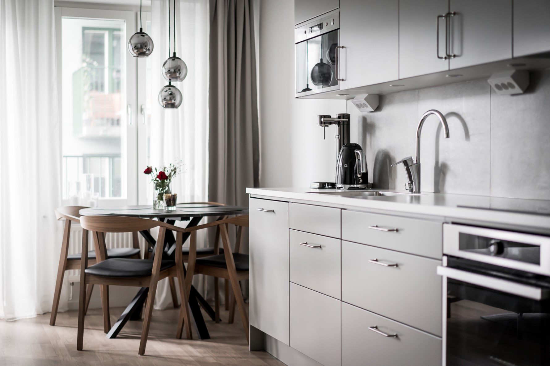 Sobert kök med ljusgrå inredning från Ballingslöv som stilrent matchar med ljusgrått stänkskydd och ljusbänkskiva. Här erbjuds goda förvaringsmöjligheter i såväl skåp som lådor. Den maskinella utrustningen kommer från Whirlpool och utgörs av inbyggd fläkt, spishäll, inbyggd ugn, inbyggd mikro, integrerad diskmaskin samt kombinerad kyl och frys.