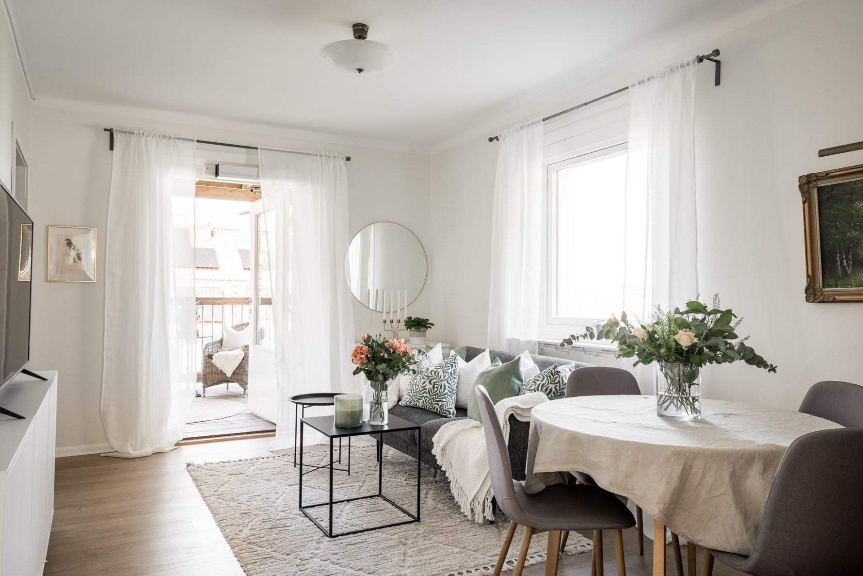 Vidare kommer man till vardagsrummet som även det har eftertraktat gavelläge samt utgång till en altan i väster. Vardagsrummet kan inredas med soffa och matsalsbord. Golvet kläs av nylagt Pergogolv och väggarna är vitmålade.