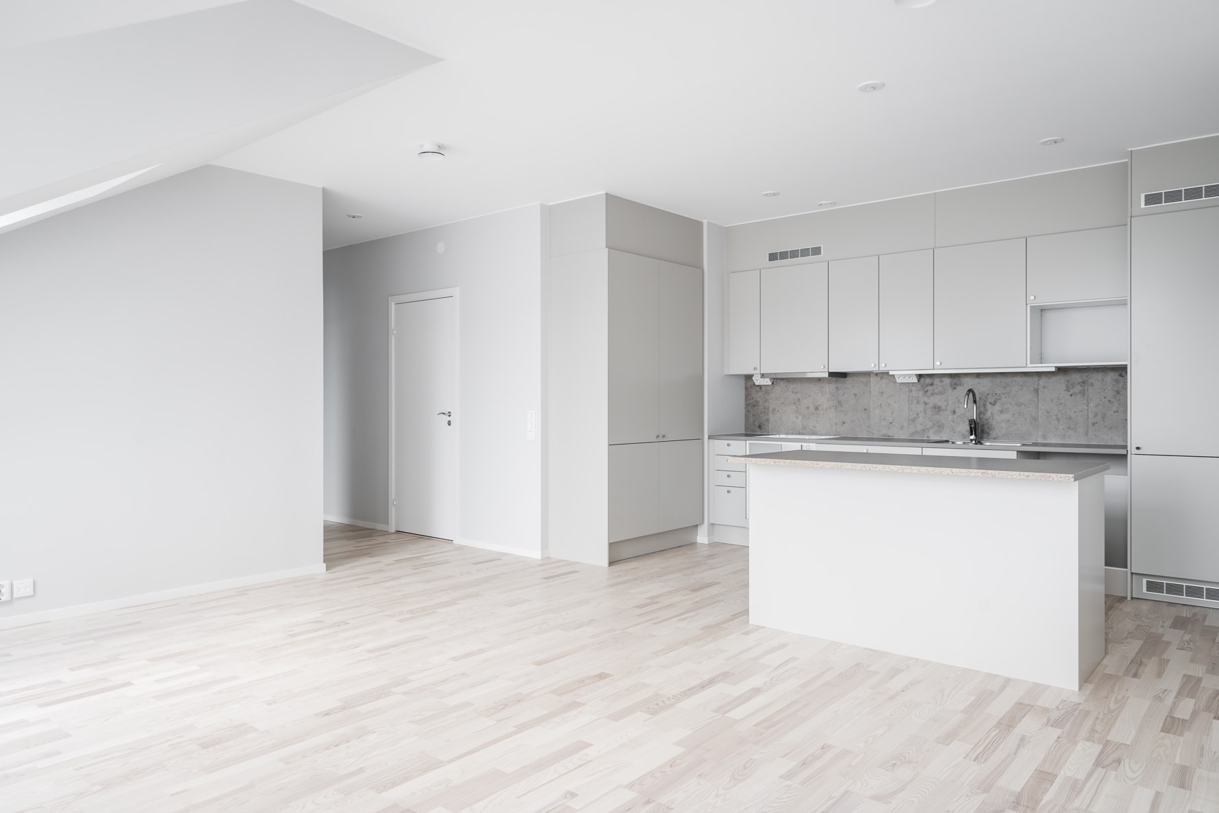 Vi välkomnas i en öppen hall med plats för avhängning direkt till höger innanför ytterdörren. På golvet ligger klinkergolv i granitkeramik som säljarna gjort ett extra tillval och väggarna är målade i ljusa kulören NCS 100-N. Från klinkergolvet övergår sedan det till genomgående parkettgolv i ask Skagen, även detta ett extratillval.