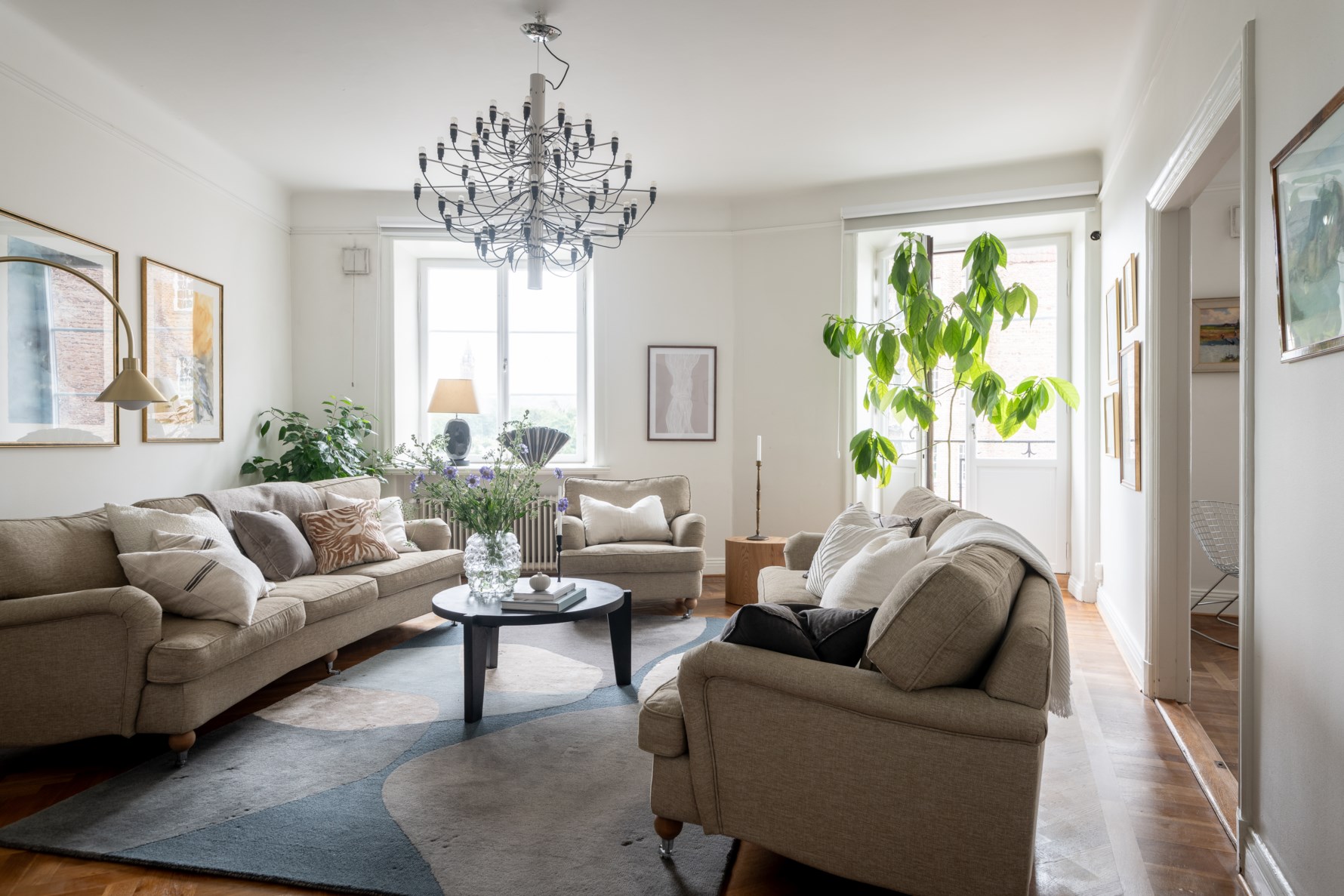 Från hallen kliver vi in i detta ljusa och luftiga rum. Givetvis finner vi de förväntade detaljerna som tjugotalsklassicismen erbjuder i form av listverk och generös takhöjd. Spröjsade fönster med vy över Linnéplatsen och en fransk balkong med utsikt mot Rosengatan. Flertalet möbleringsalternativ lämnas med plats för soffgrupp och sittgrupp.