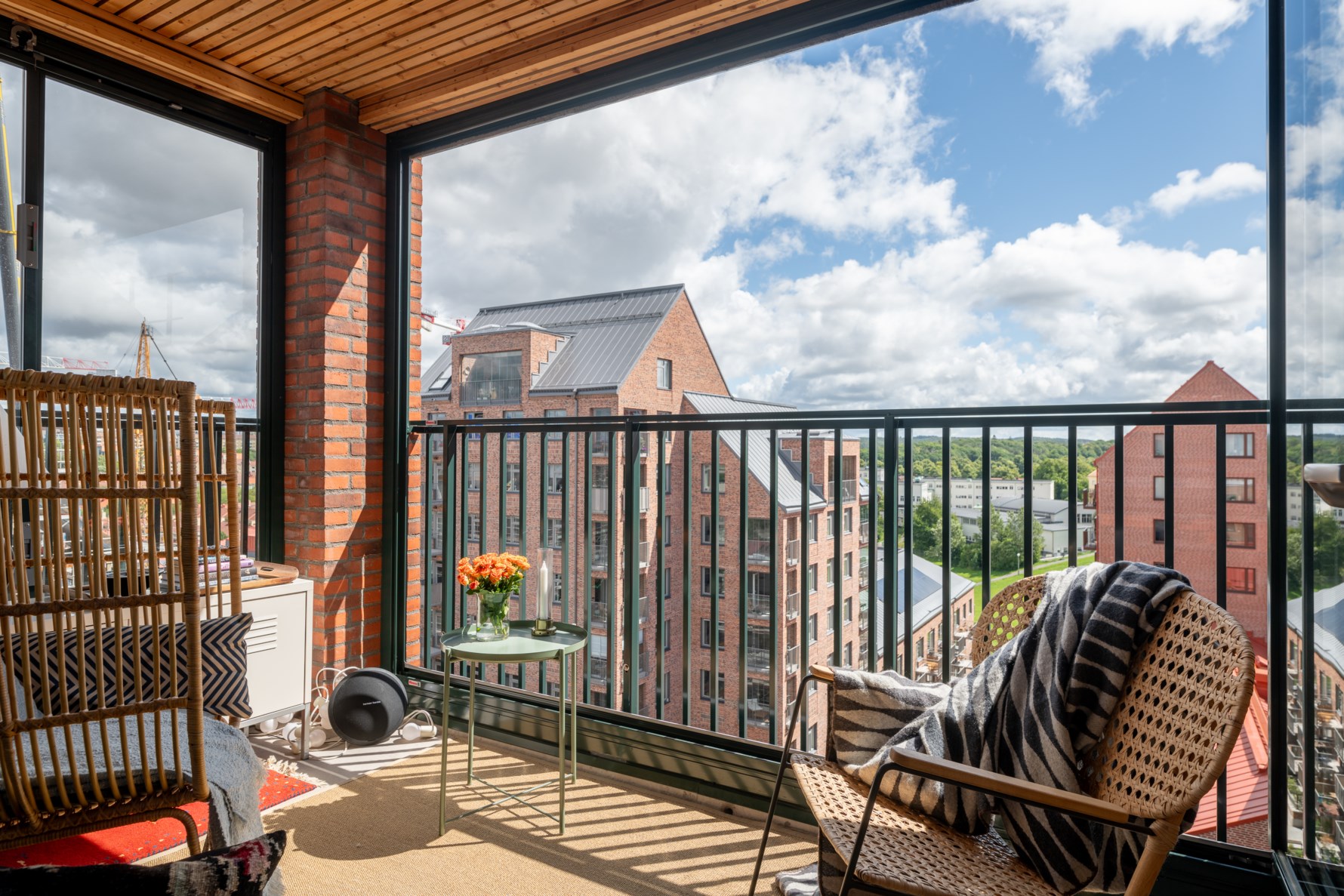 Lägenhetens sällskapsytor har ett härligt läge med generöst ljusinsläpp från fönster i två olika väderstreck och utgång till balkongen som är inglasad i soligt söderläge. Den öppna planlösningen mellan kök och vardagsrum bjuder in till social samvaro och gemenskap med gott om plats för en soffgrupp med tillhörande möblemang och matbord.
