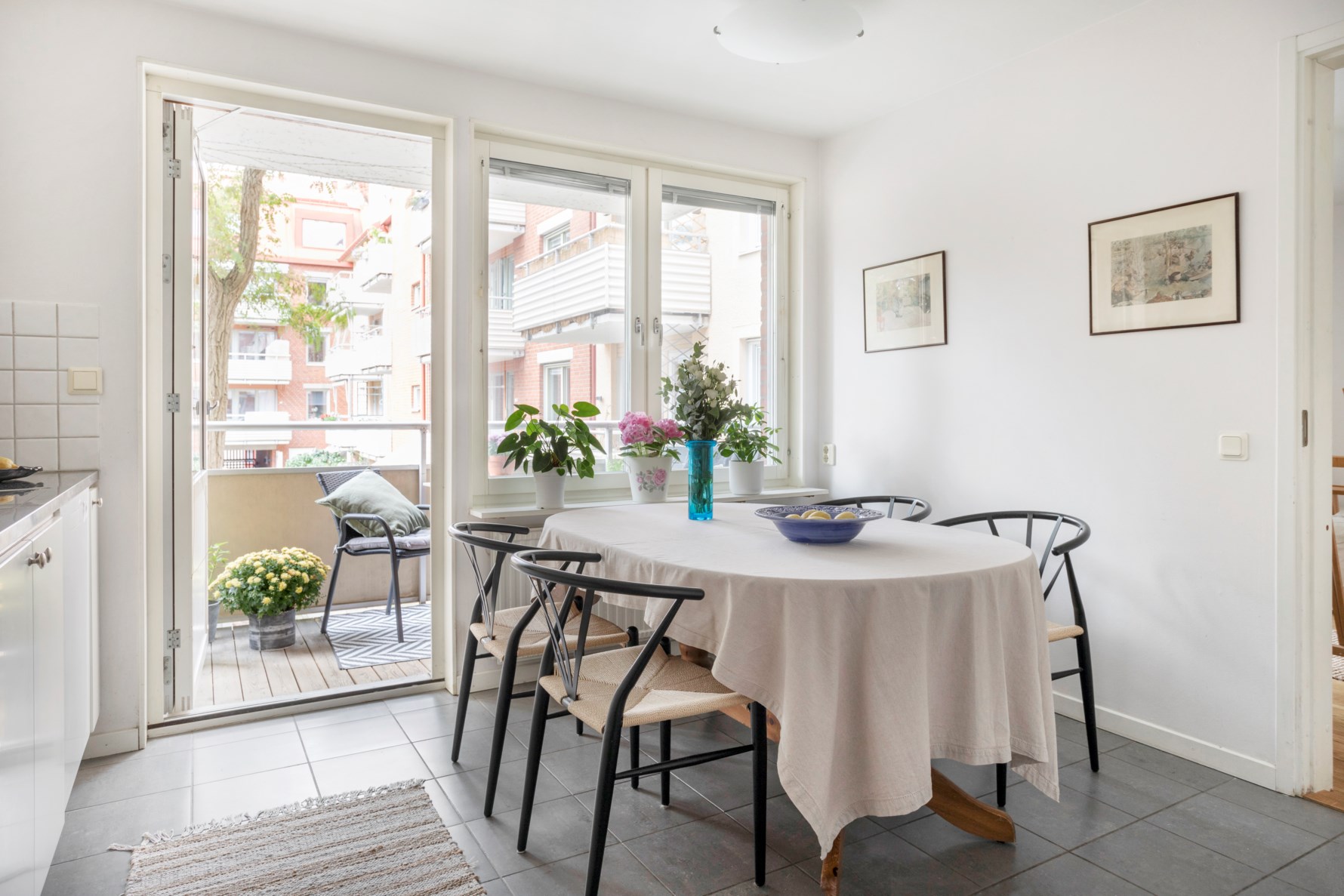Trivsamt kök med fint ljusinsläpp och utgång till lägenhetens härliga balkong som har ett suveränt läge med eftermiddagssol och utsikt över innergården. Köket har fina arbetsytor och bra förvaring. I köket ryms en matplats för fyra till sex personer.