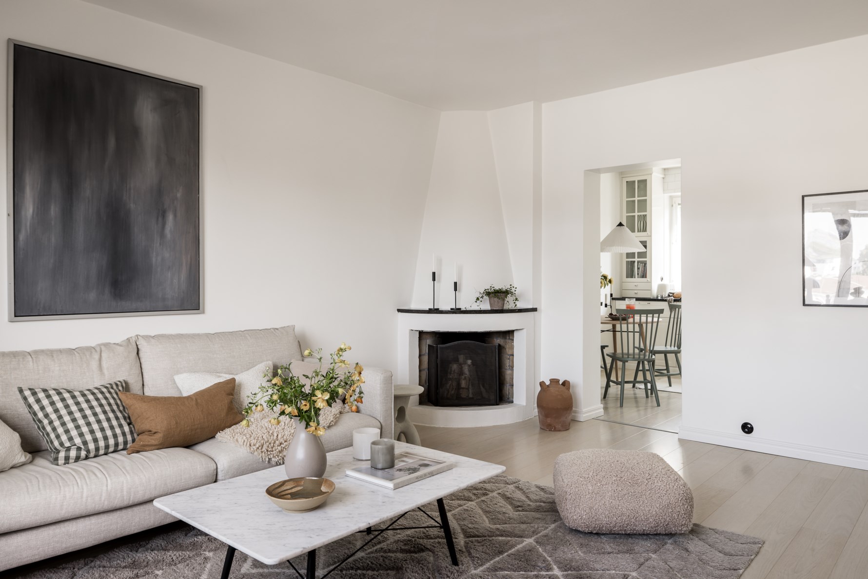 Vidare in i lägenheten finner ni vardagsrummet med en bevarad fin öppenspis som ger en mysfaktor under de kalla månaderna. Här ges flera möbleringsalternativ med plats för soffgrupp, tv-hörna samt ytterligare matplatser. Generöst ljusinsläpp från stort fönsterparti samt direkt utgång till balkong öppnar upp hela rummet. Den soliga balkongen med västerläge har plats för en mysig utemöbel och är en perfekt plats att börja morgonen på på sommaren.