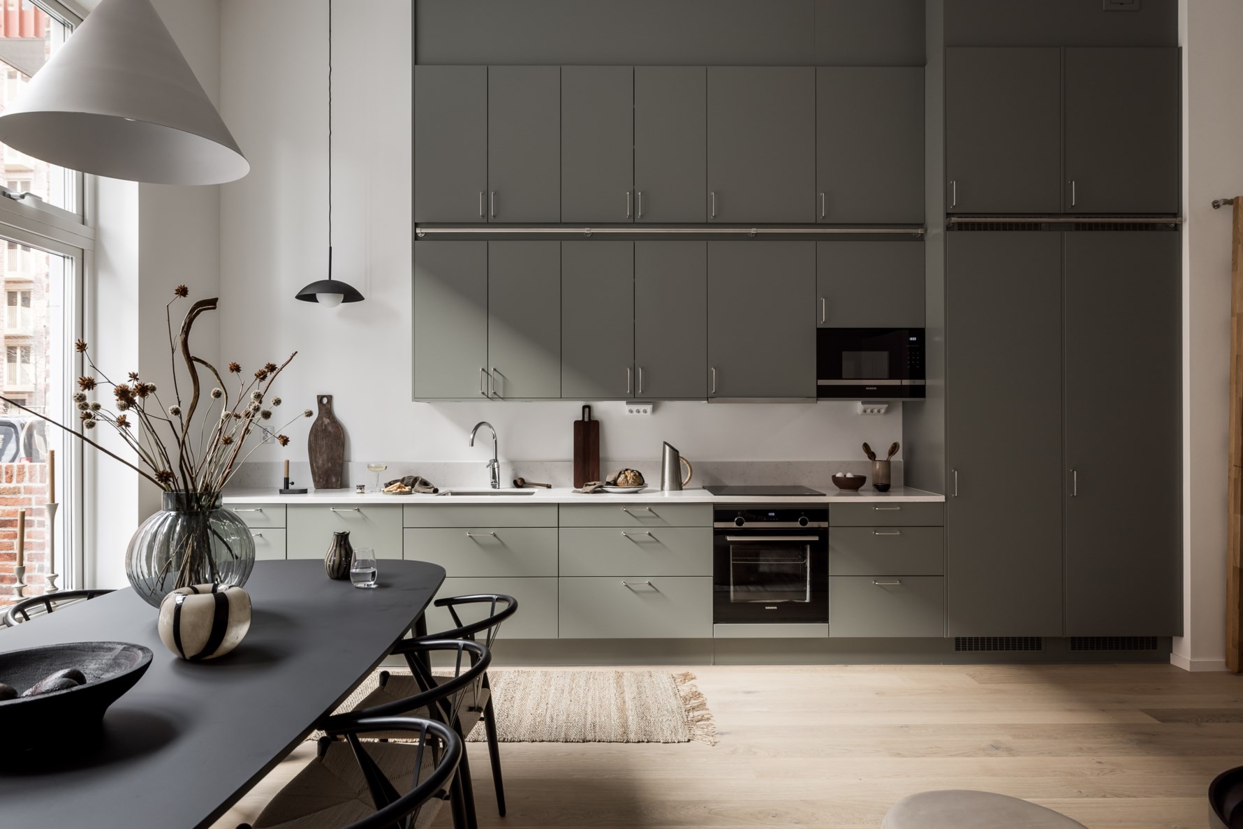 Köket från HTH har fullutdragslådor och dämpare till både luckor och lådor. Luckor i en behaglig grön ton med rostfria handtag tillsammans med bänkskiva och stänkskydd i komposit. Spis med induktionshäll, inbyggnadsugn, inbyggnadsmikro, integrerad diskmaskin från Siemens samt integrerad kyl och frys i fullhöjd.