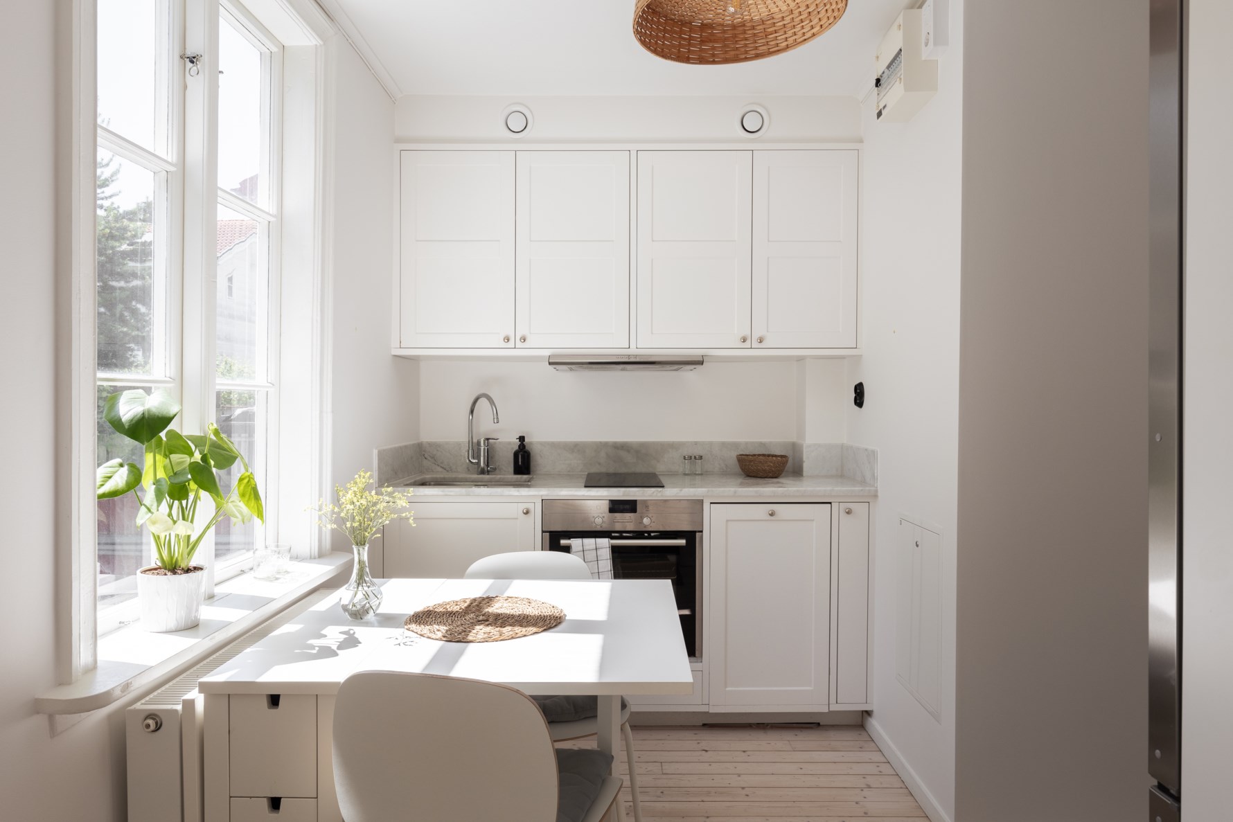Platsbyggt kök i shakerstil med vita luckor samt bänkskiva och stänkskydd i Carraramarmor. Den maskinella utrustningen består av induktionshäll (Cylinda), kolfilterfläkt, inbyggnadsugn, integrerad diskmaskin samt kyl med frys (Siemens). Samtliga vitvaror installerades 2017 i samband med att köket renoverades. Förvaringsmöjligheter i en platsbyggd garderob och städskåp. Härligt ljusinsläpp och fin utsikt mot grönska. Invid fönstret ryms en matplats.