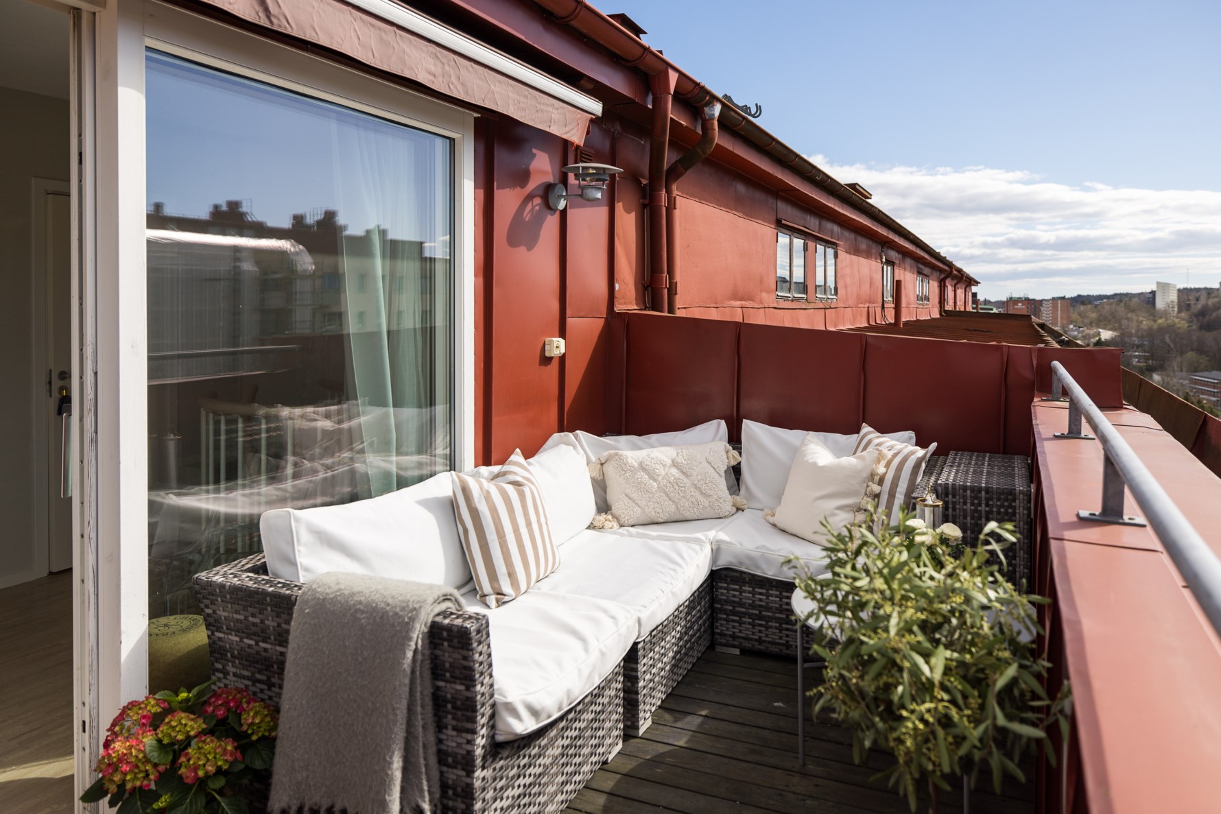 När ni tar trappan upp till lägenhetens övre plan möts ni av ett stort rum som kan användas som både allrum och sovrum. Här finns goda förvaringsmöjligheter i tre platsbyggda dubbelgarderober. Väggarna är målade i en ljusgrå färg och på golvet ligger fint parkettgolv. Från detta plan når ni lägenhetens underbara och soldränkta terrass.