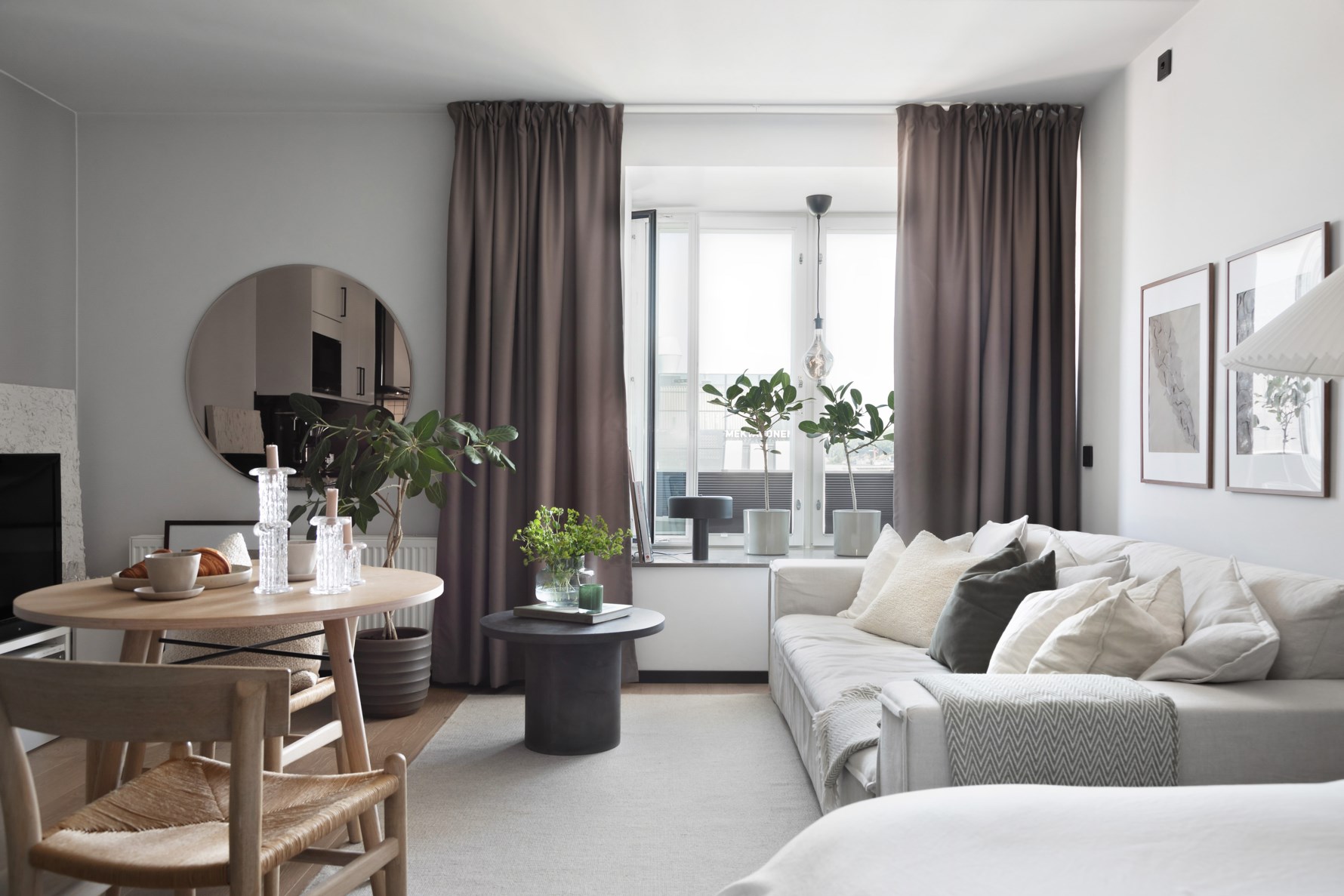 Allrummet har en studiokänsla med öppna ytor och sovdelen avskiljs med en rumsavdelare i galvaniserad sträckmetall. Här kan ni inreda med soffa, matplats och säng. Fint fönsterparti med djup fönsternisch som kan göras till en mysig och ombonad vrå att krypa upp i.