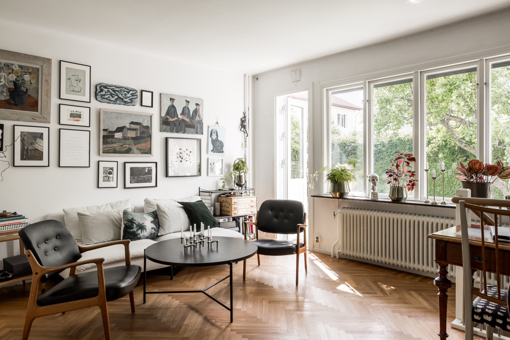 Vidare in i rummet övergår kök i vardagsrum som inrymmer soffgrupp såväl som matplats. Här finns utgång till den härliga uteplatsen som både blir ett extra rum under varma sommarmånader samt erbjuder odlings- och planteringsmöjligheter.