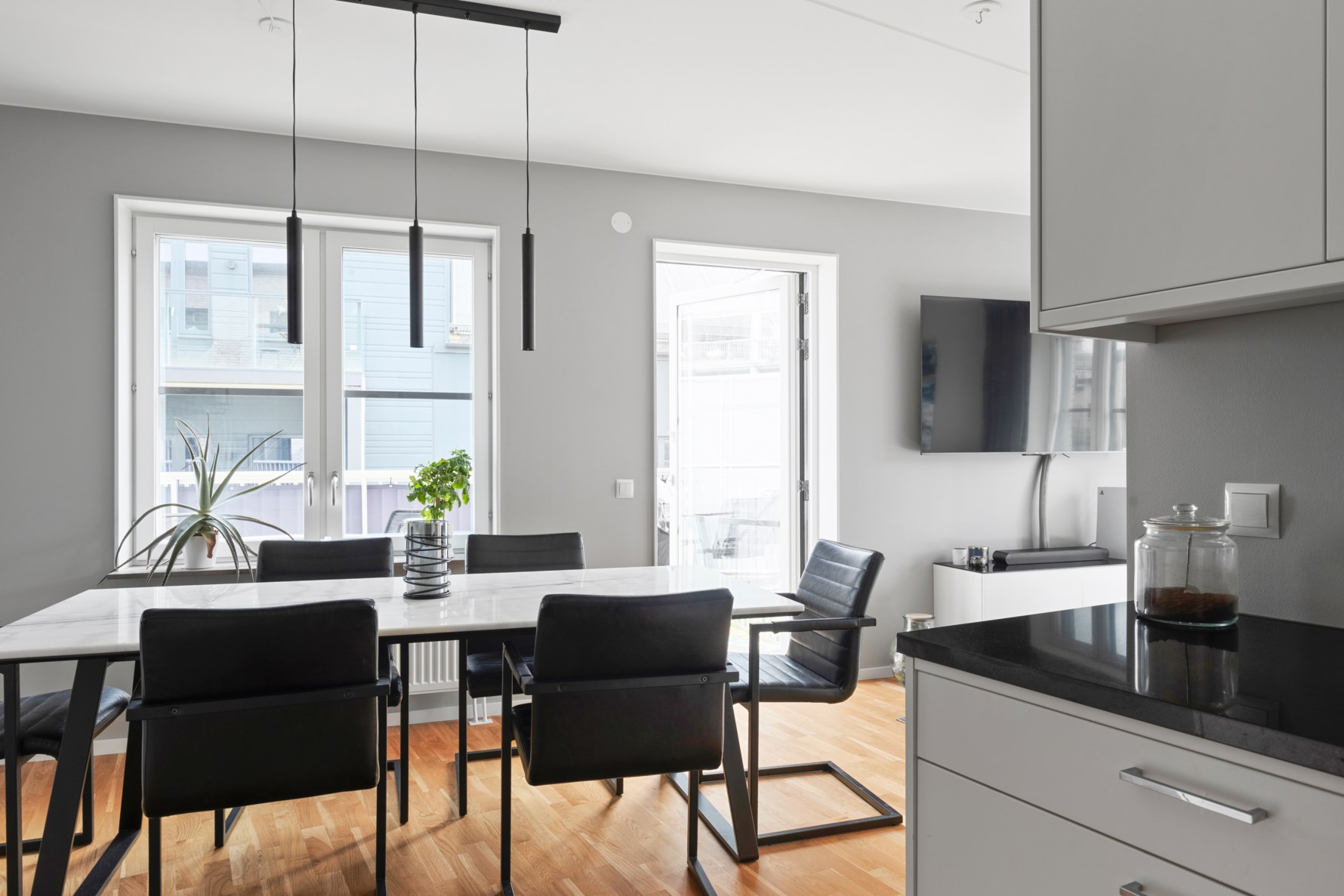 Det stora vardagsrummet har öppen planlösning mot köket och utgång till den härliga balkongen i söderläge. I vardagsrummet trivs man på stora sociala ytor och rummet erbjuder gott om utrymme för såväl matplats som soffgrupp. Stora fönster bidrar med härligt ljusinsläpp som skapar luftighet och rymd åt hela bostaden. Även här är väggarna gråmålade.