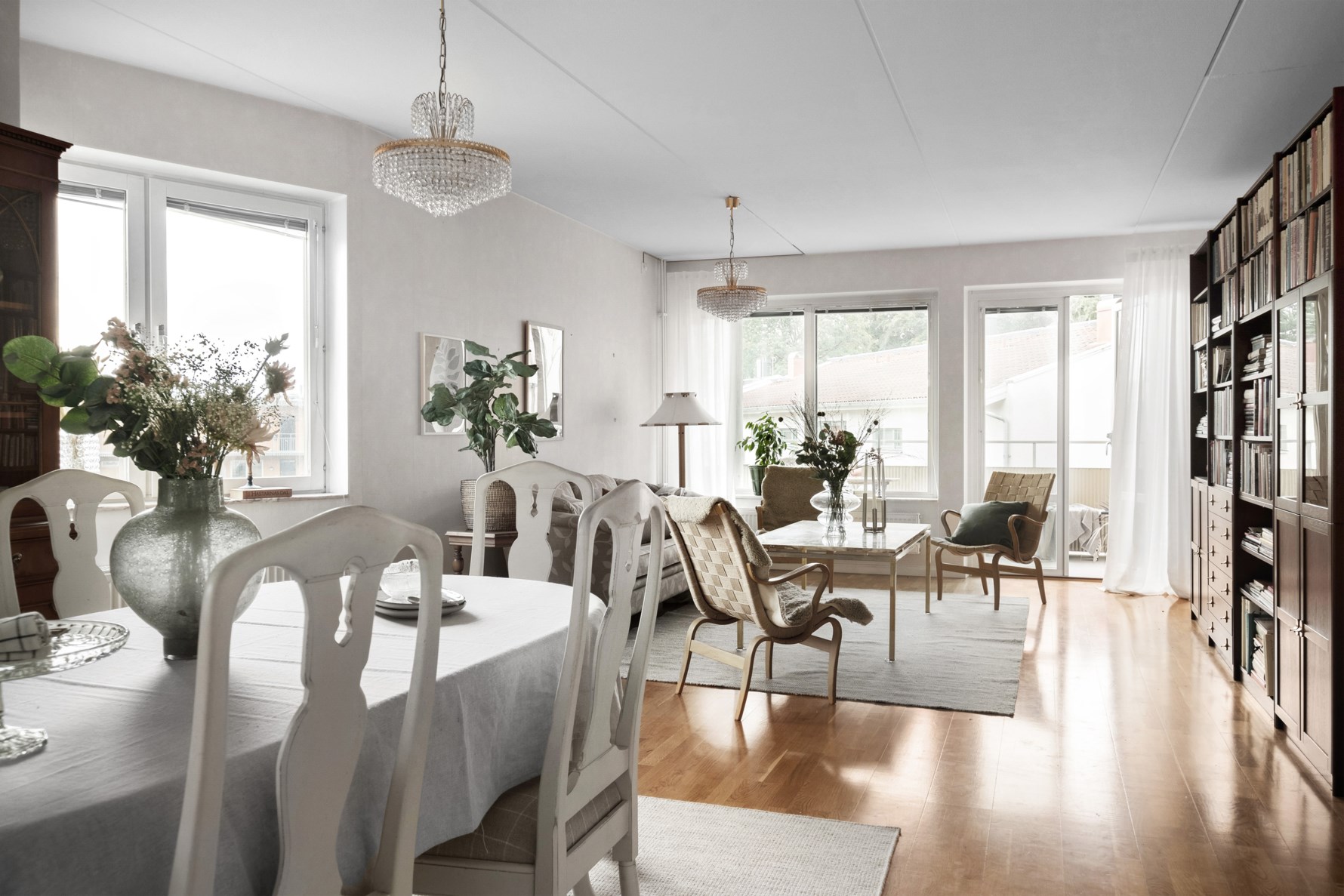 Ett par steg in når ni den öppna och sociala planlösningen mellan kök och vardagsrum. Rummet kan inredas med soffgrupp och matbord samt övrig inredning. Generösa fönsterpartier öppnar upp och skapar rymd i det redan fantastiska rummet. Från vardagsrummet når ni bostadens härliga balkong. Balkongen är rymlig med grönskan som närmsta granne, här finns plats för middagssällskap och ytan möjliggör många olika möblemang. Soldränkt söderläge med ytterst många soltimmar att njuta av mot den lummiga gården.