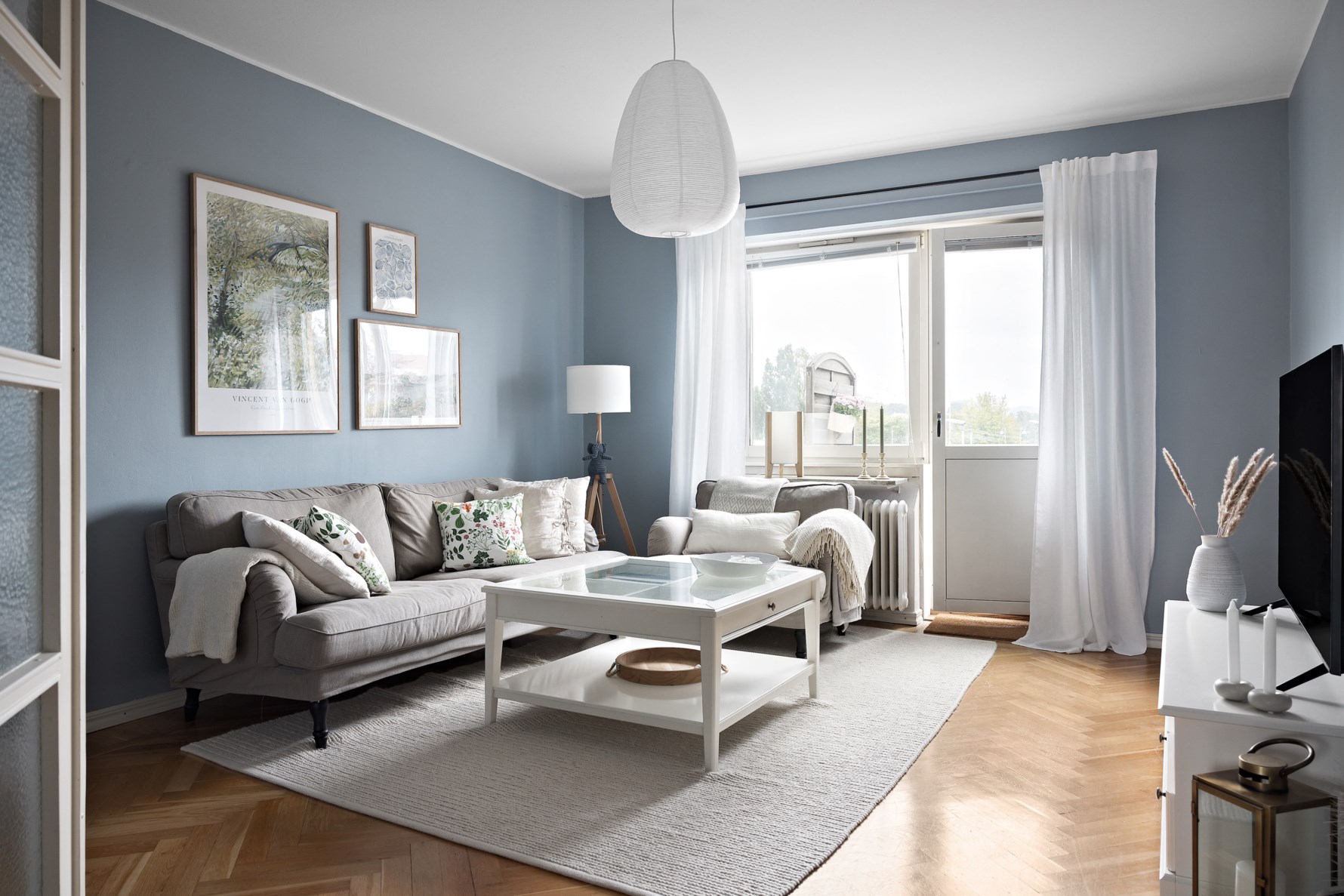 Vardagsrummet är av generös storlek och här inryms enkelt en större soffgrupp samt en matplats om man så önskar. Den fina fiskbensparketten ger tillsammans med pardörrarna och stenbänkskivorna en genuin och ombonad känsla och den mysiga balkongen som vetter mot söder skapar också trivsel då det blir den naturliga platsen under årets varmare månader.