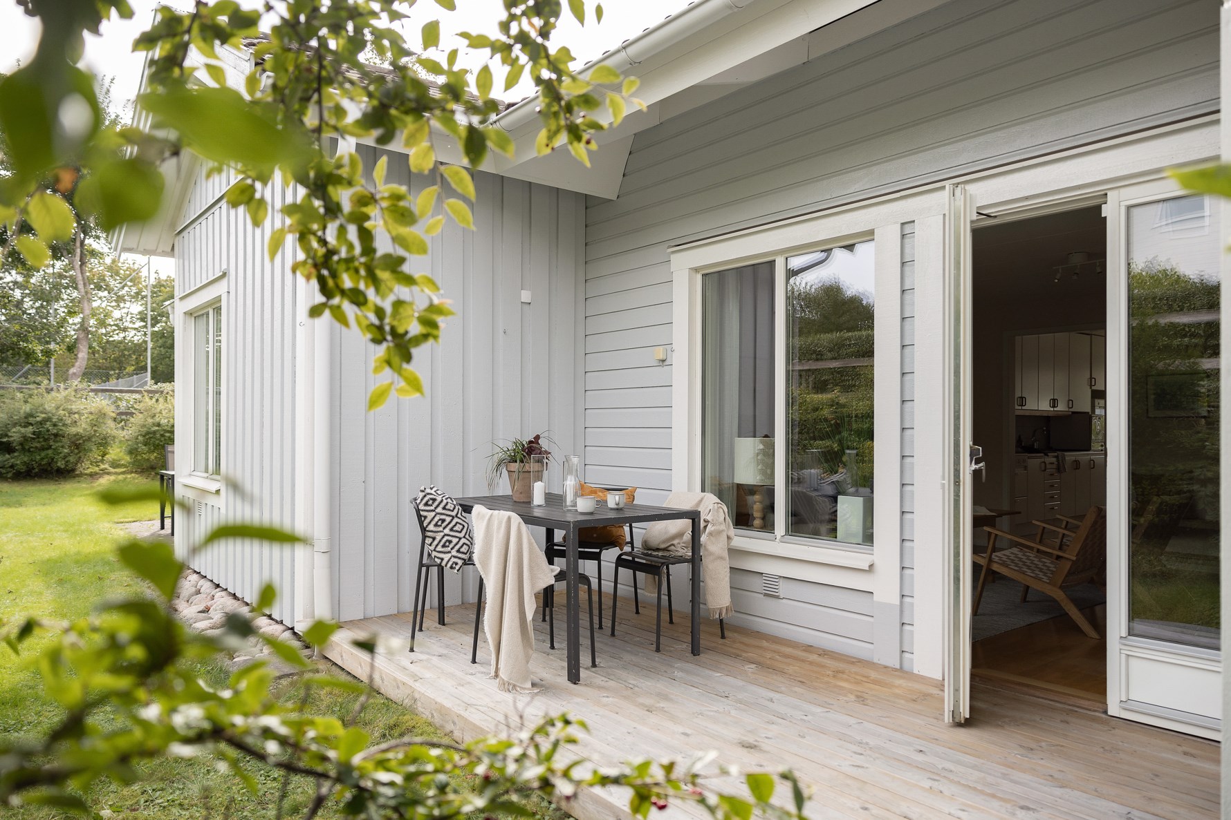 Vardagsrummet är ljust och luftigt med en naturlig övergång till uteplatsen, en perfekt plats för att njuta av lugna stunder eller sociala sammankomster i solen.