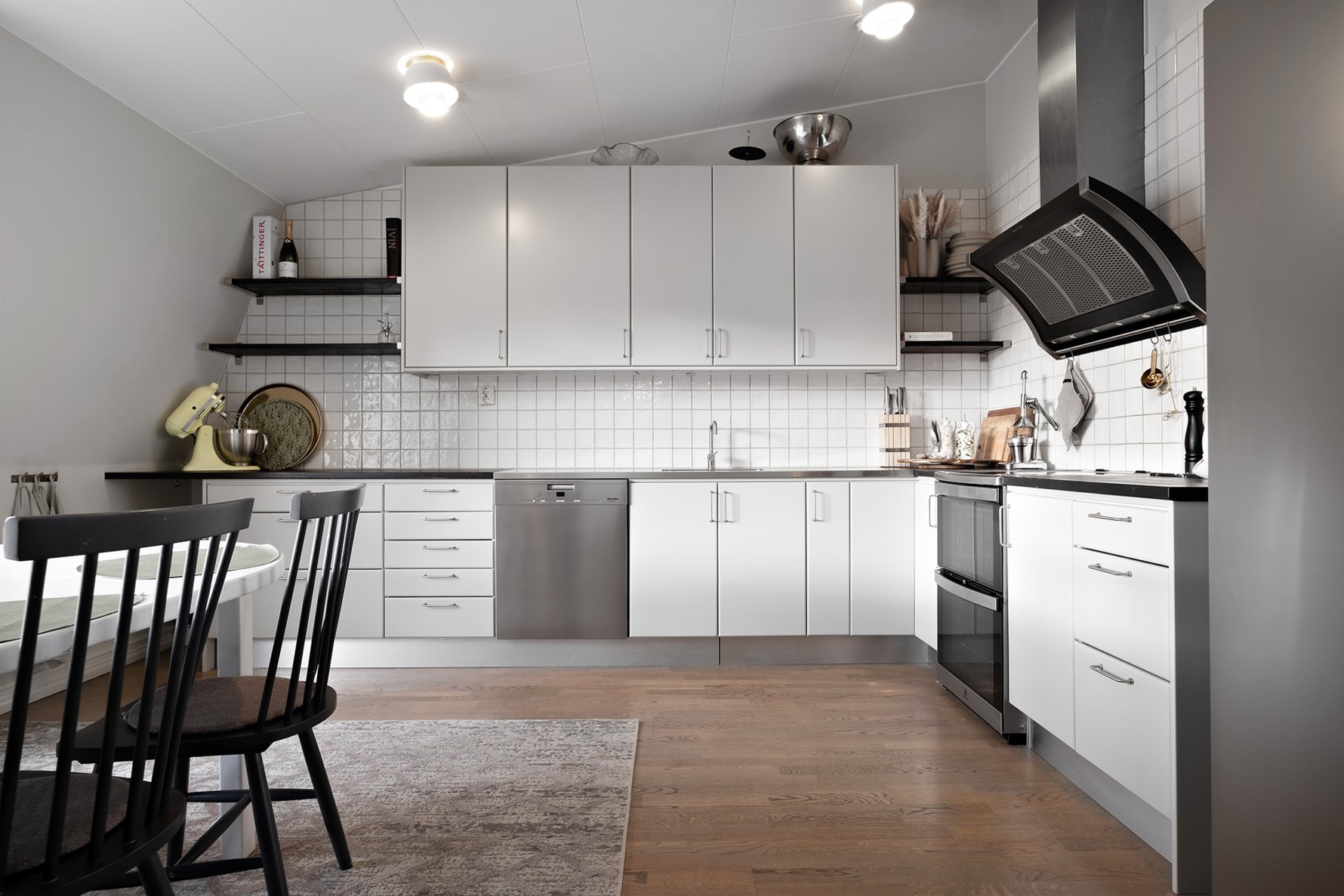 Stort socialt kök med klassisk köksinredning i ljust utförande från Ballingslöv och Myresjökök, bänkytor i svartoljad ek samt stänkskydd i vitt kakel. Praktiskt utformat med goda förvaringsmöjligheter och generösa arbetsytor. Den maskinella utrustningen utgörs av spis med induktionshäll och dubbla ugnar med varmluftsfunktion från Husqvarna, kolfilterfläkt från Fjäråskupan, diskmaskin i rostfritt från Miele samt dubbla kyl och fyrs i fullhöjd i rostfritt. I köket finns utrymme för större middagssällskap på upp till 12 personer och ett generöst fönsterparti bidrar med ljusinsläpp.