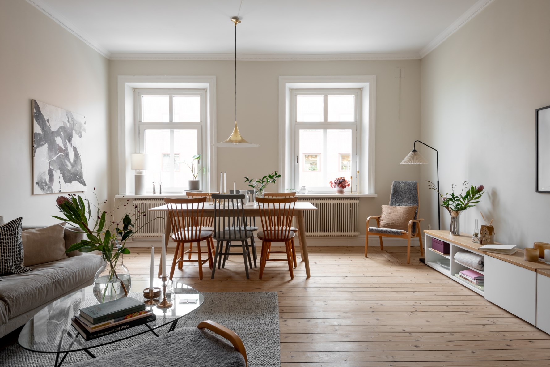 Ett väl tilltaget vardagsrum med stora fönsterpartier mot Karl Gustavsgatan som låter ljuset flöda. Flertalet möbleringsalternativ och plats för soffgrupp, sittgrupp och matsalsbord.