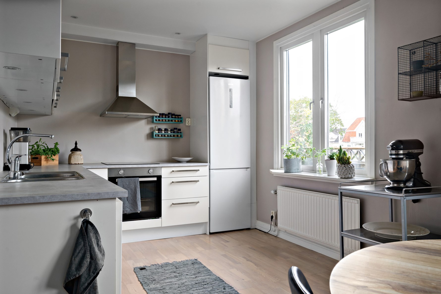 Köket är vitt och har bra med förvaring och arbetsytor. Nya bänkskivor och luckor på underskåpen installerades 2023. Utrustningen består av kombinerad kyl/frys (2022), diskmaskin (2020), ugn/häll från (2024) och kolfilterfläkt. En större matplats för 6-8 personer finns invid fönstret.