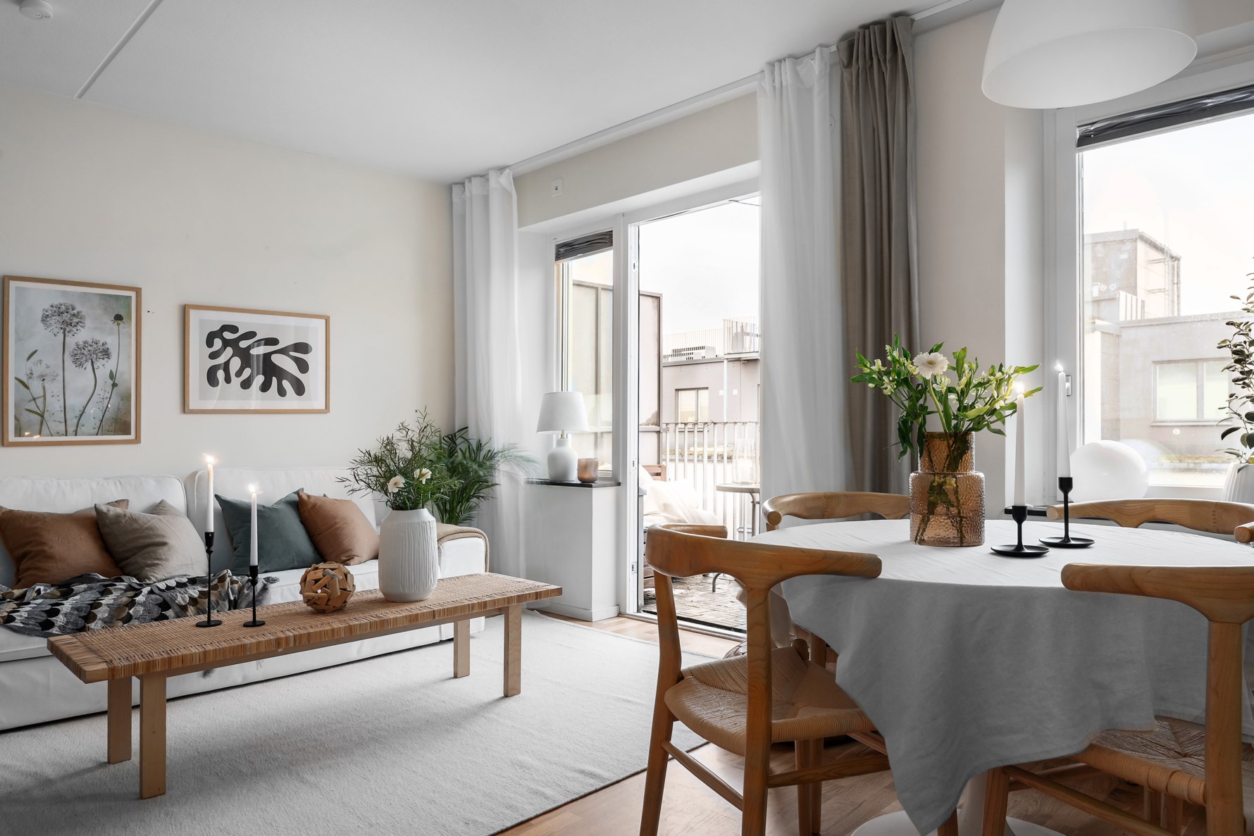 Vidare in till allrummet med en öppen planlösning med både kök och vardagsrum samt utgång till den härliga balkongen. Stora fönsterpartier och balkongdörren skapar ett härligt ljusinsläpp. I vardagsrumsdelen finner ni plats för soffgrupp. På andra sidan av rummet finner ni köksdelen med plats för matbord och stolar. Detta skapar en social planlösning som är perfekt för trevliga tillställningar. Bostadens balkong i västerläge bjuder in till mysiga kvällar i kvällssolen och här ryms mindre soffgrupp med bord.